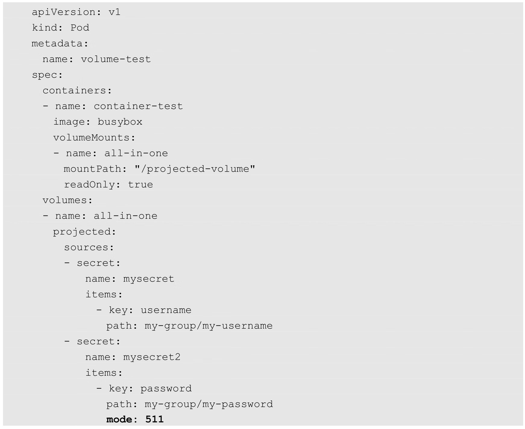 下面是一个使用Projected Volume挂载两个Secret资源,其中一个设置了非默认挂载模式(mode)的示例: