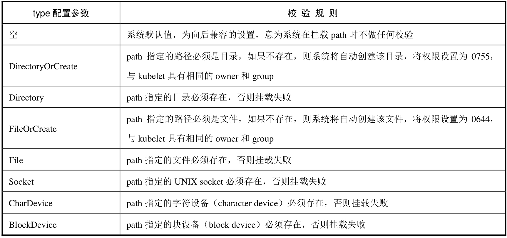 表8.1 HostPath的type配置参数和校验规则