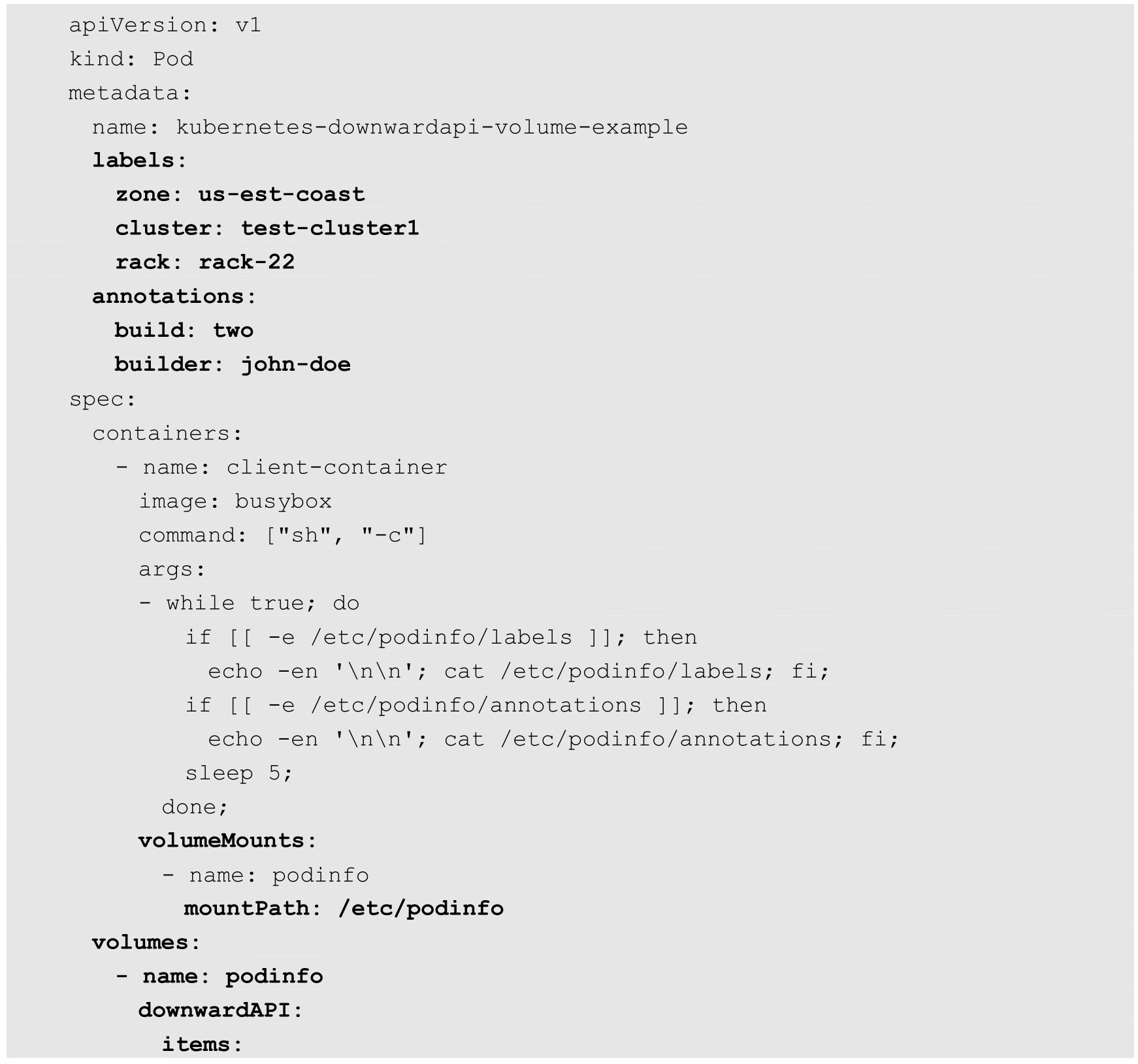 通过Downward API可以将Pod或Container的某些元数据信息(例如Pod名称、Pod IP、Node IP、Label、Annotation、容器资源限制等)以文件的形式挂载到容器内,供容器内的应用使用。下面是一个将Pod的标签通过Downward API挂载为容器内文件的示例: