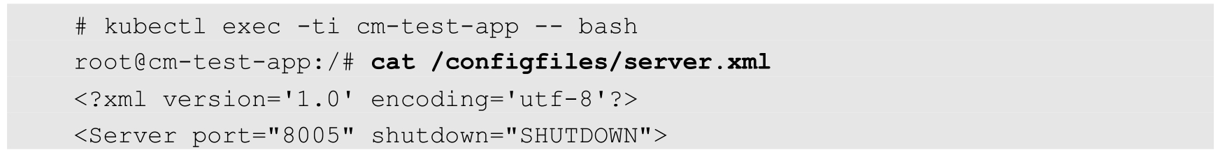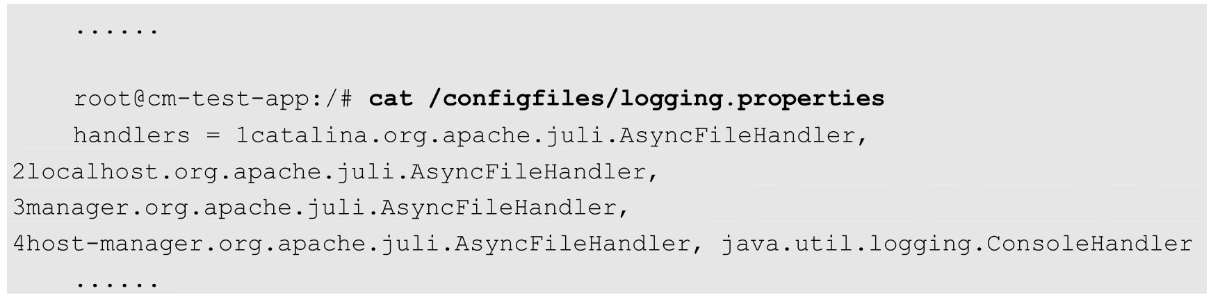 在Pod成功创建之后,进入容器内查看,可以看到在/configfiles目录下存在server.xml和logging.properties文件: