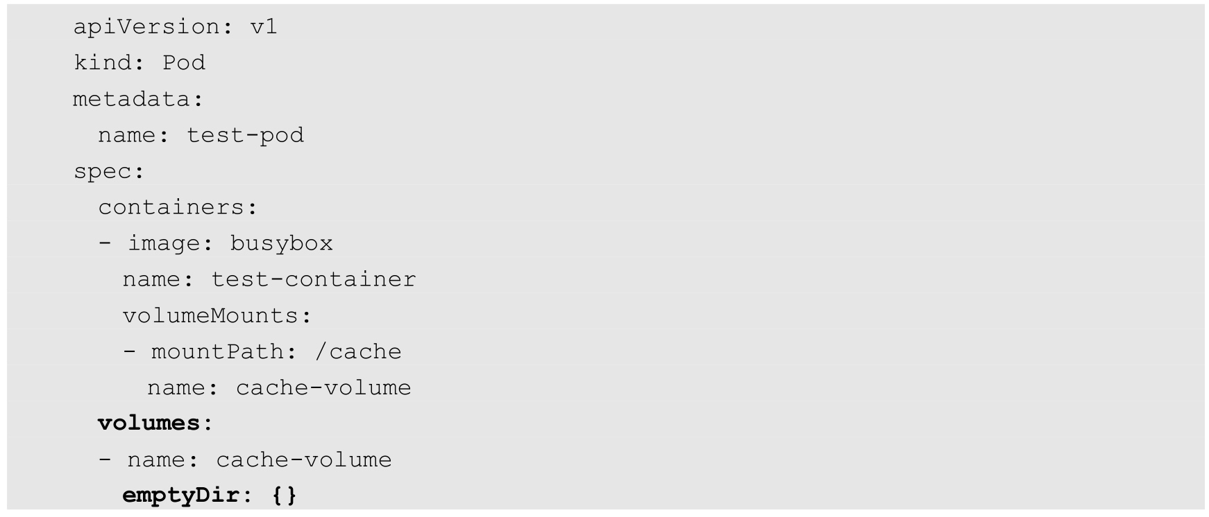 下面是使用EmptyDir类型的存储卷的Pod的YAML配置示例,该类型的存储卷的参数只有一对花括号“{}”:
