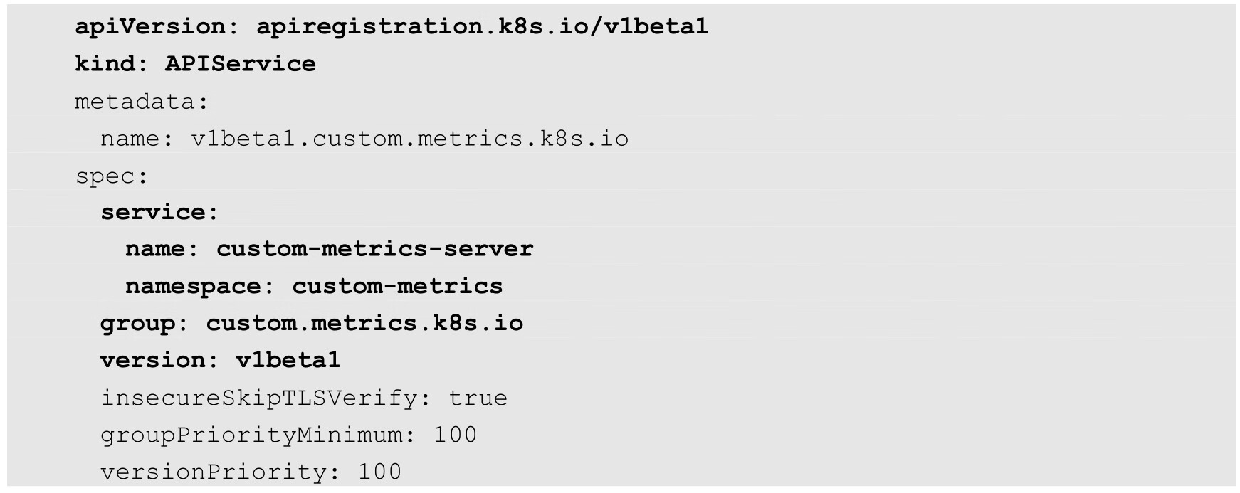 在service段通过name和namespace设置了后端的自定义API Server,本例中的服务名为custom-metrics-server,命名空间为custom-metrics。