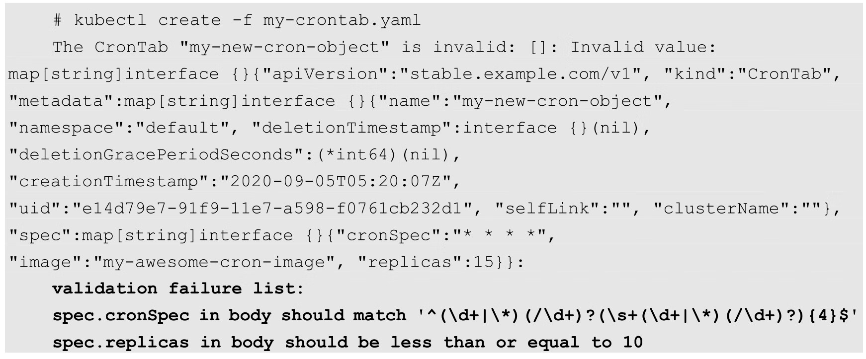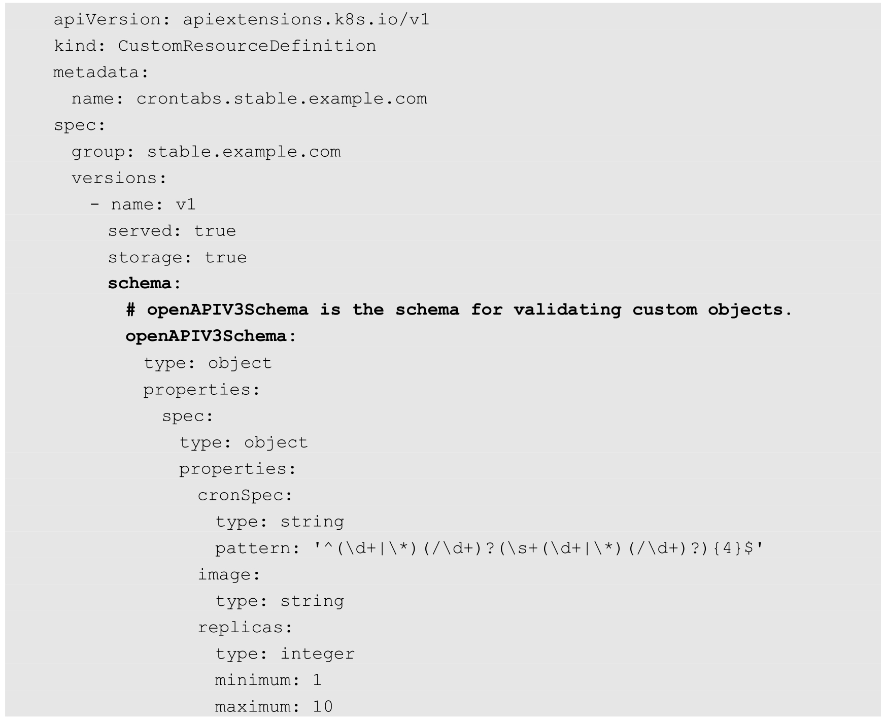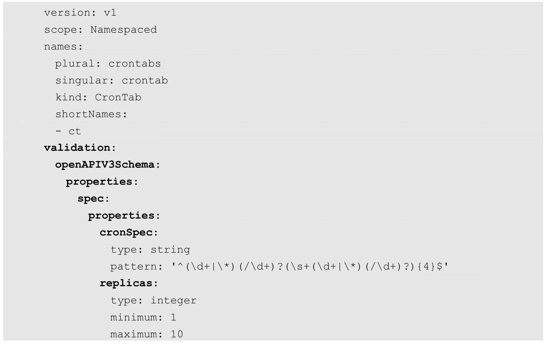 下面的例子为CRD定义中的两个字段(cronSpec和replicas)设置了校验规则: