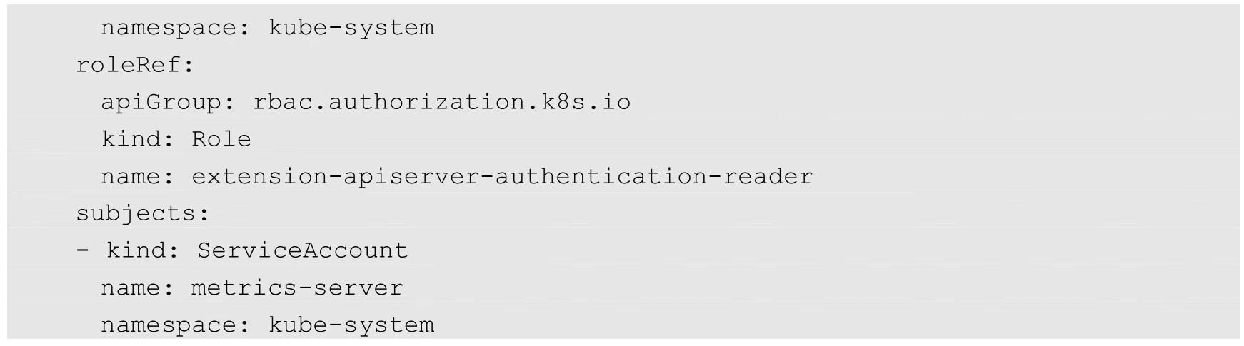 (13)使用之前创建的ServiceAccount为系统Role“extension-apiserver-authentication-reader”创建一个Rolebinding,以允许自定义API Server访问名为“extension-apiserver-authentication”的系统ConfigMap。