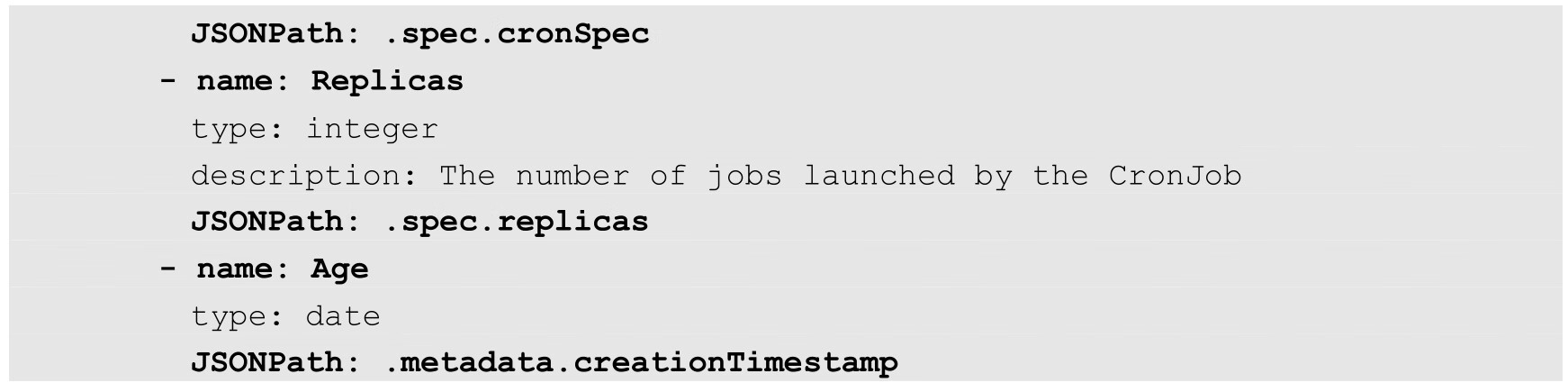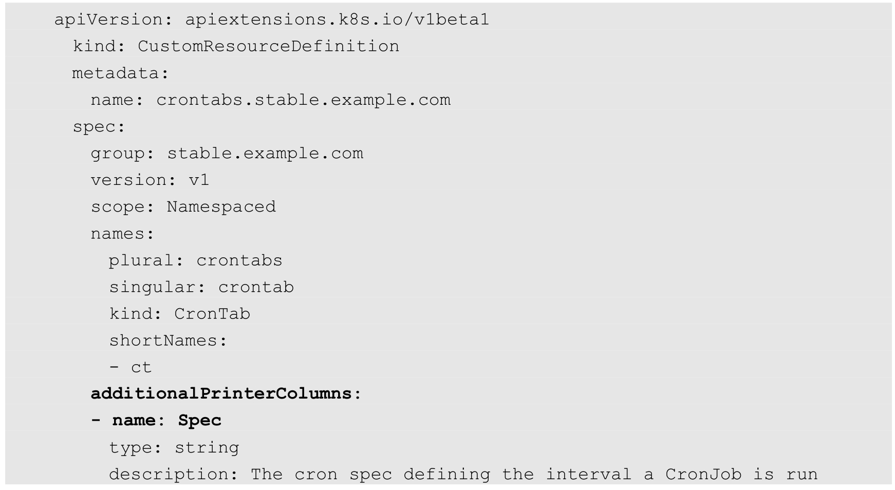 从Kubernetes 1.11版本开始,通过kubectl get命令能够显示哪些字段由服务端(API Server)决定,还支持在CRD中设置需要在查看(get)时显示的自定义列,在spec.additionalPrinterColumns字段设置即可。