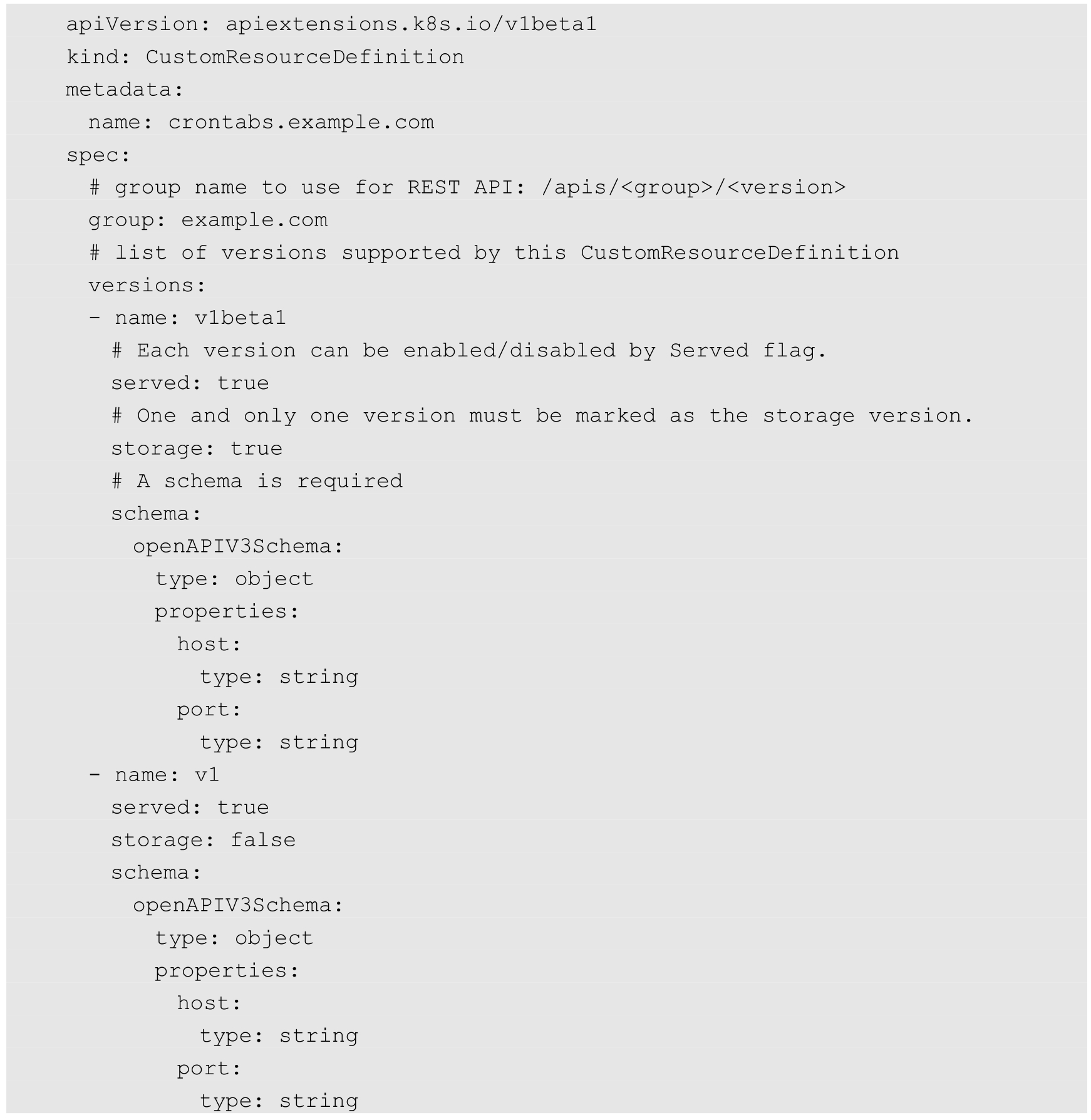 Kubernetes发展到1.17版本时,CRD资源对象的多版本特性达到稳定阶段。用户在定义一个CRD时,需要在spec.versions字段中列出支持的全部版本号,例如在下面的例子中,CRD支持v1beta1、v1两个版本: