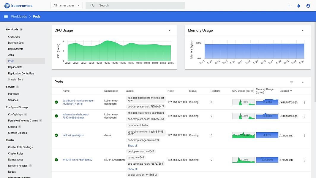 最后,将上面的token输入登录页面,即可登录Dashboard查看Kubernetes集群的概览信息。概览页面默认显示命名空间default中的资源,可以通过上方的下拉列表选择不同的命名空间进行查看,也可以查询所有命名空间的资源,如图10.21所示。