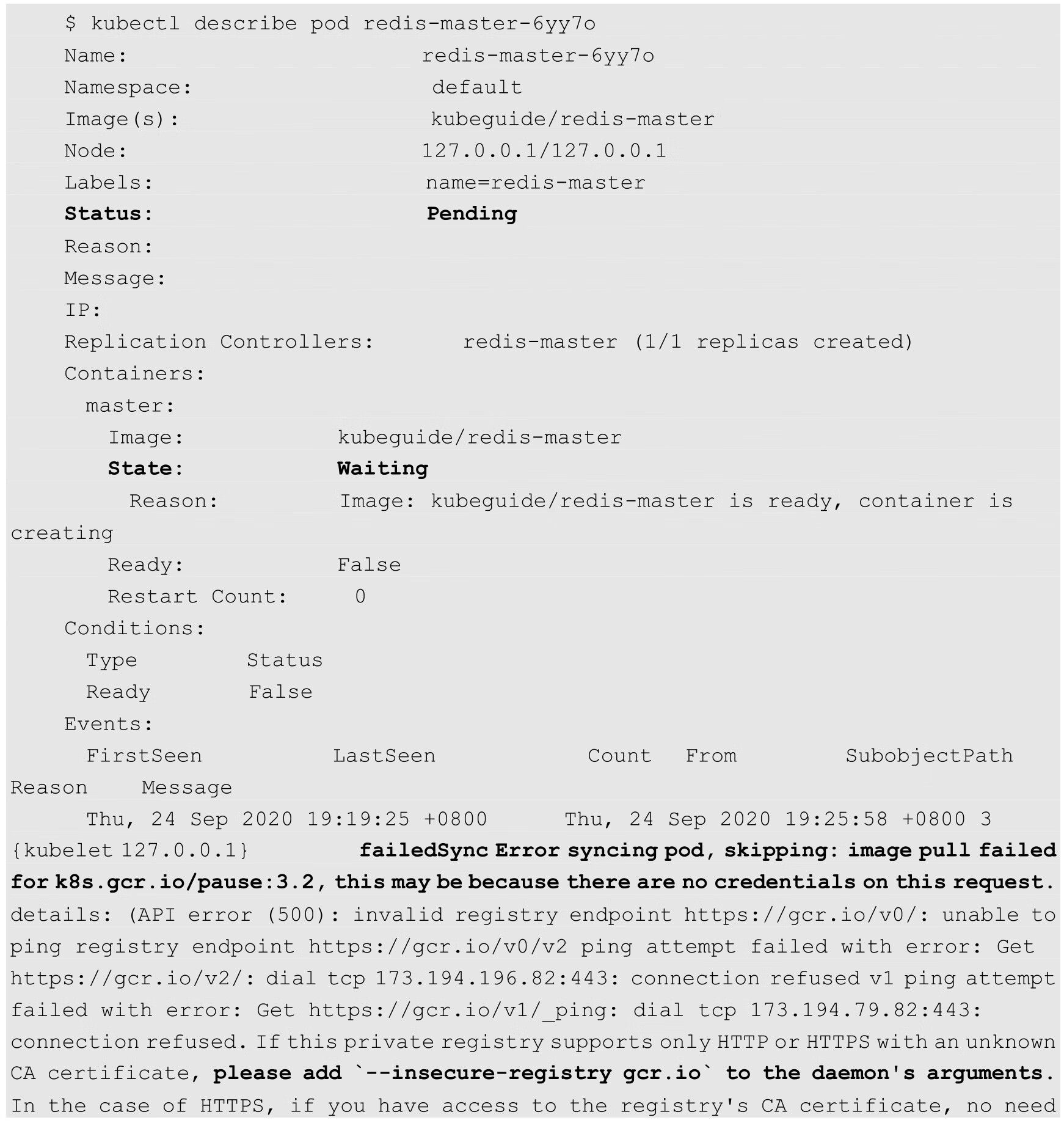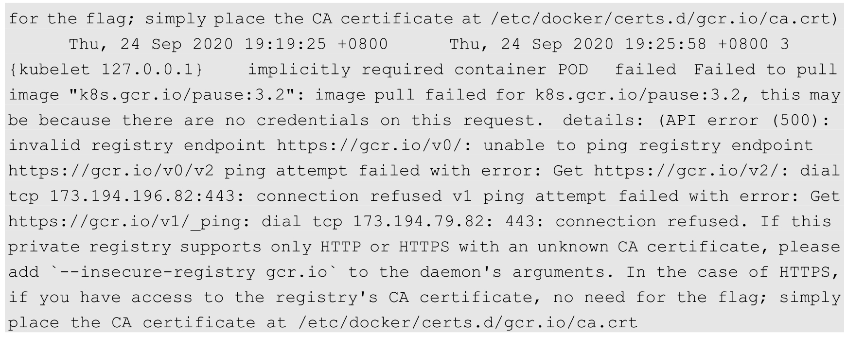 可以看到,该Pod为Pending状态。从Message部分显示的信息可以看出,其原因说明是image pull failed for k8s.gcr.io/pause:3.2,即系统在创建Pod时无法从gcr.io下载pause镜像,导致创建Pod失败。