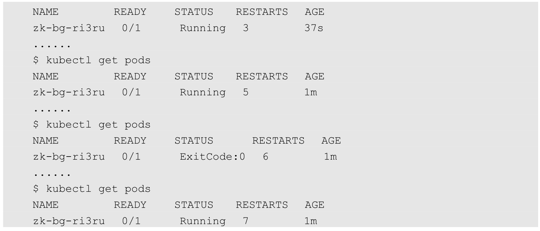 可以看到Pod已经创建成功,但Pod一会儿是Running状态,一会儿是ExitCode:0状态,在READY列中始终无法变成1/1,而且RESTARTS(重启的数量)的数量不断增加。这通常是因为容器的启动命令不能保持在前台运行。
