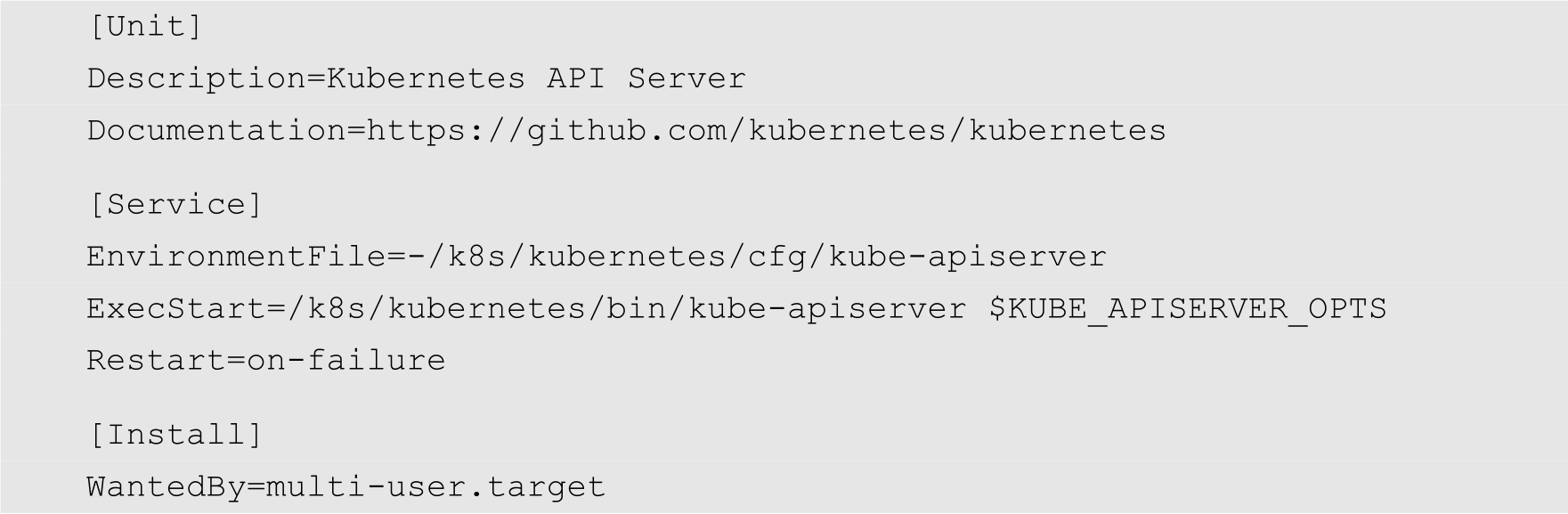 然后创建kube-apiserver的系统服务单元文件/lib/systemd/system/kube-apiserver.service,内容如下: