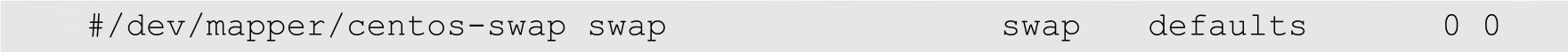 然后修改/etc/fstab文件,将交换分区对应的文件系统注释掉,如下所示: