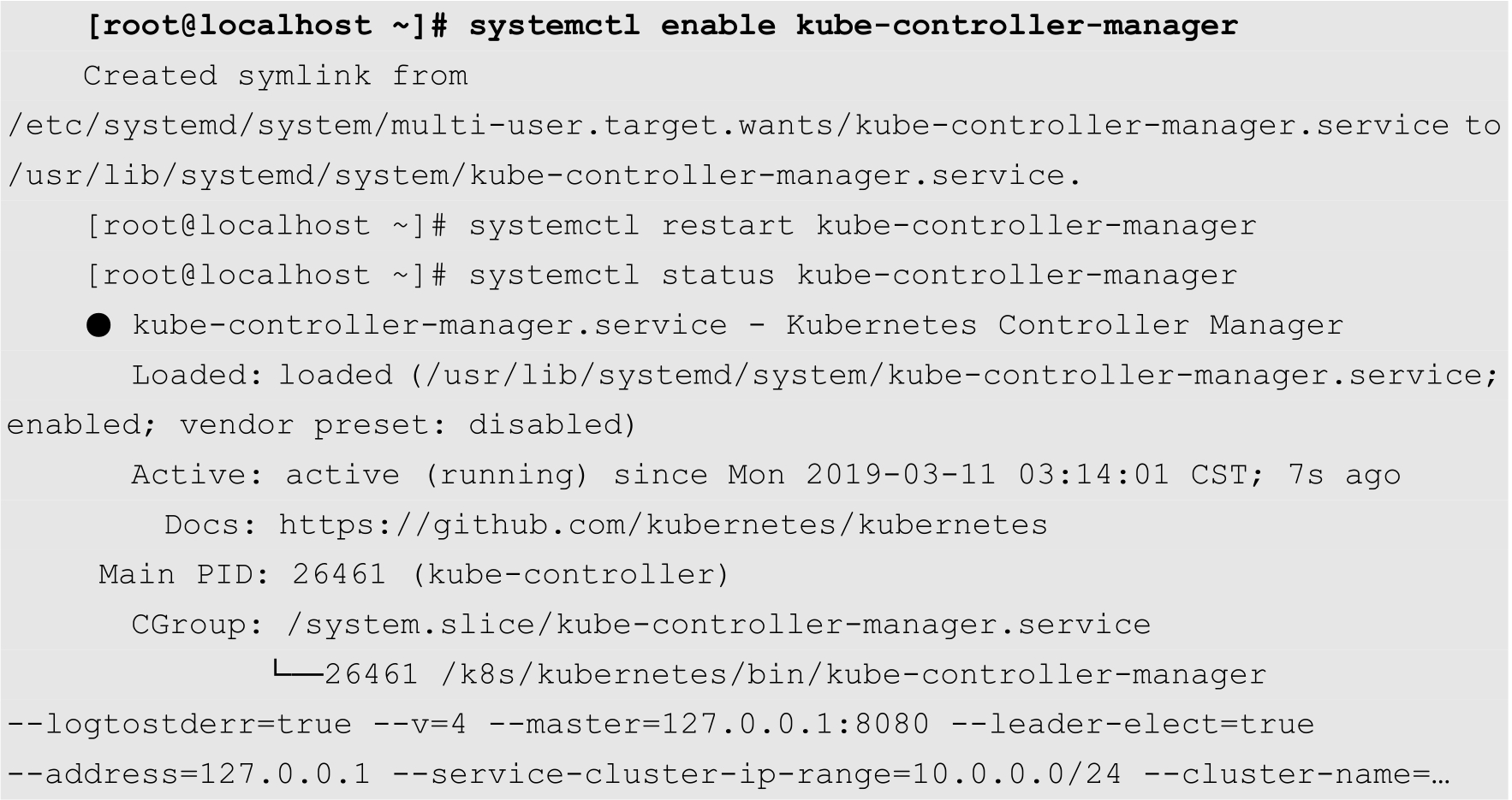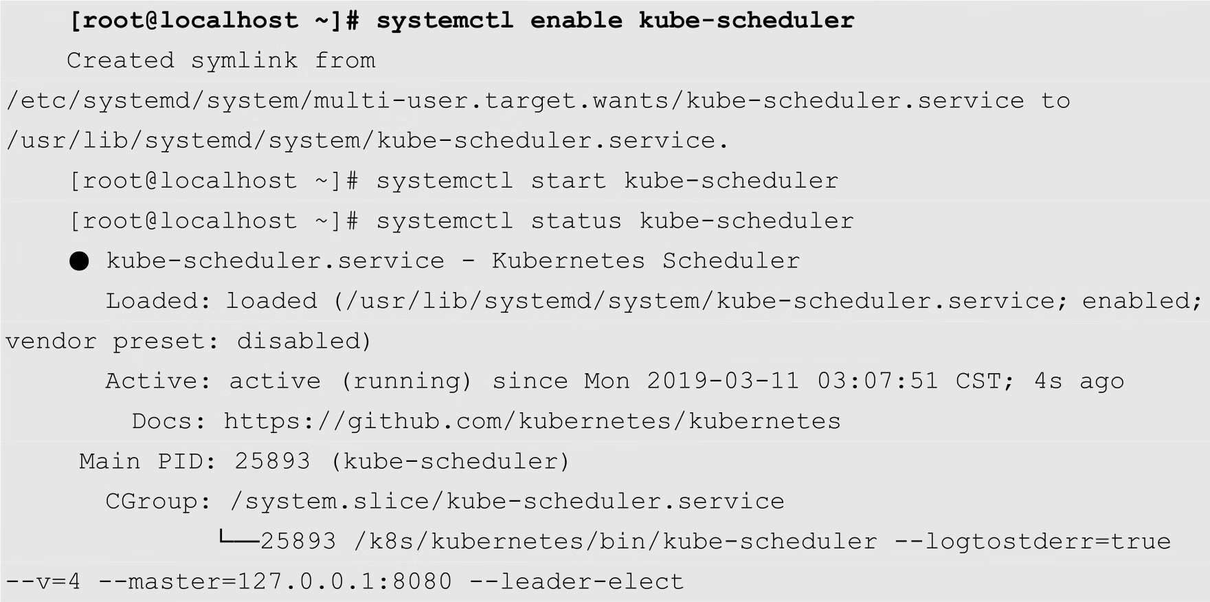 [root@localhost ~]# systemctl enable kube-apiserver [root@localhost ~]# systemctl enable kube-controller-manager [root@localhost ~]# systemctl enable kube-scheduler