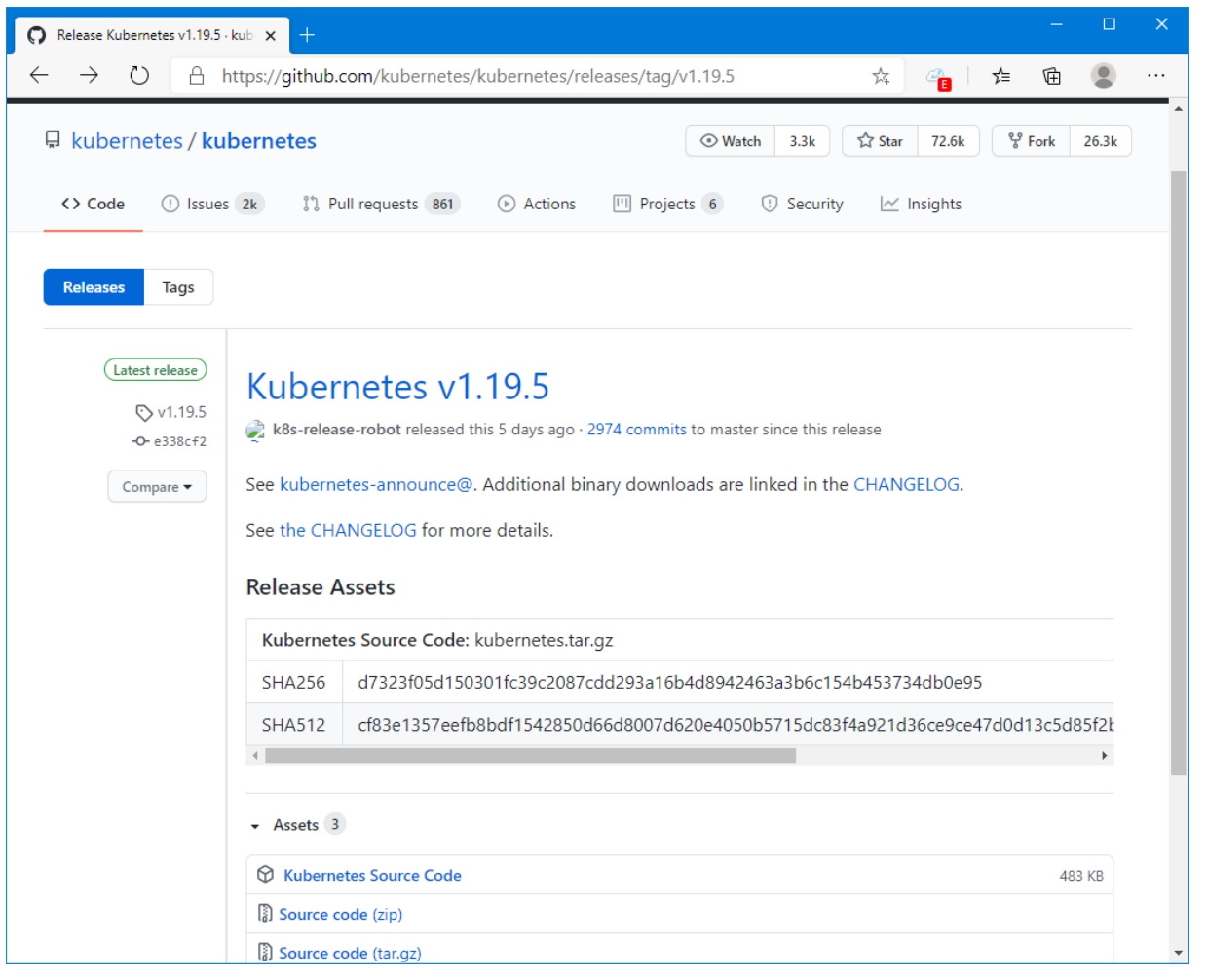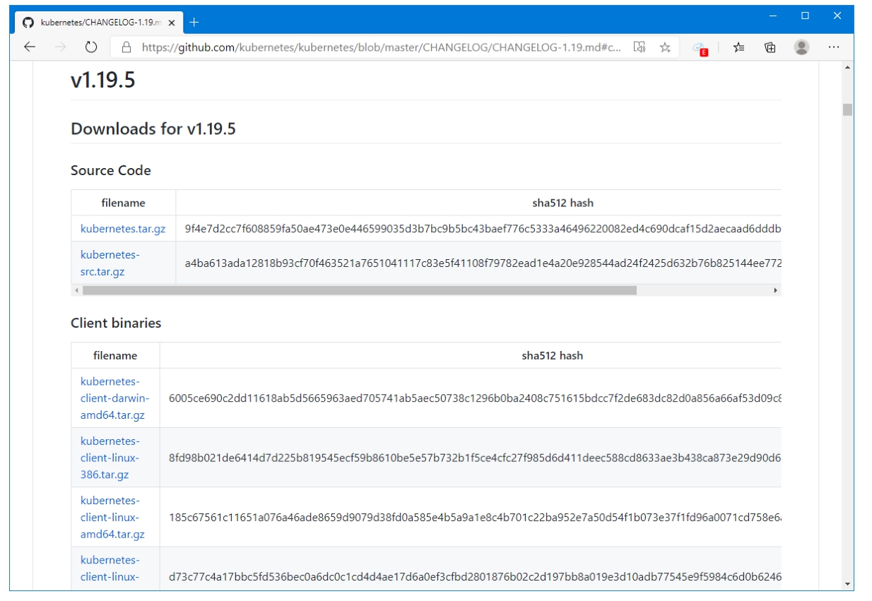 Kubernetes二进制文件的下载地址为:https://github.com/kubernetes/kubernetes/releases,其中,最新的正式版为v1.19.5,如图2-3所示。