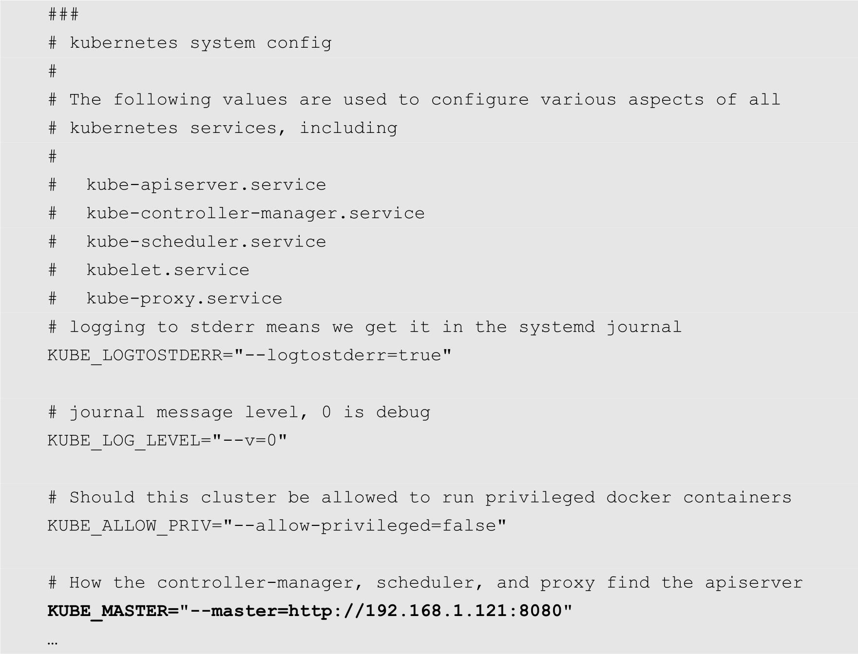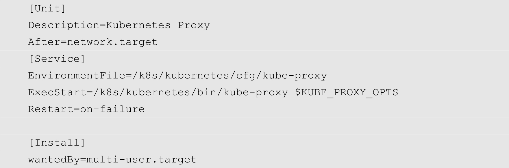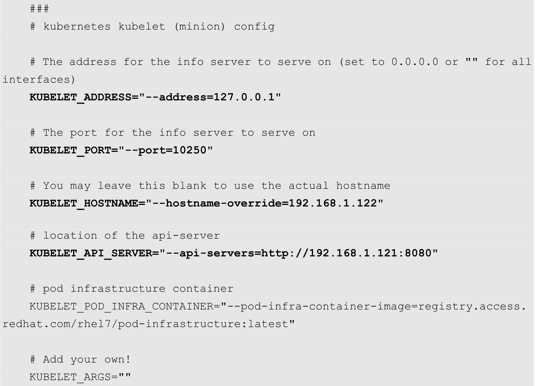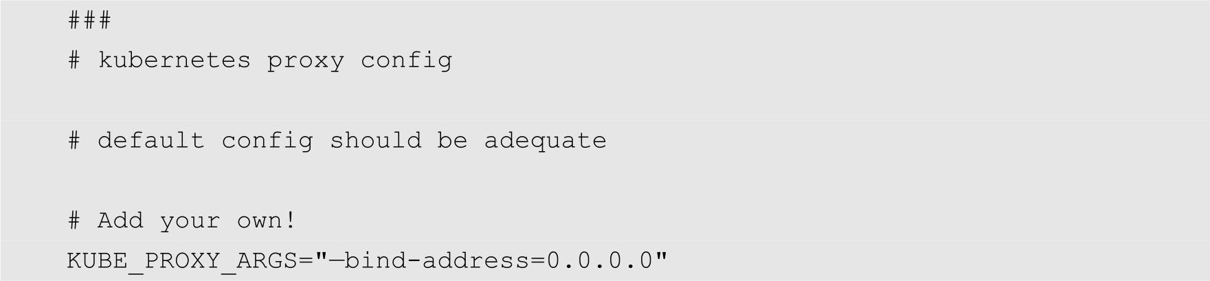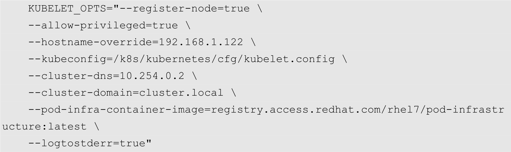 KUBE_PROXY_OPTS="--logtostderr=true \ --hostname-override=192.168.1.122 \ --master=http://192.168.1.121:8080"