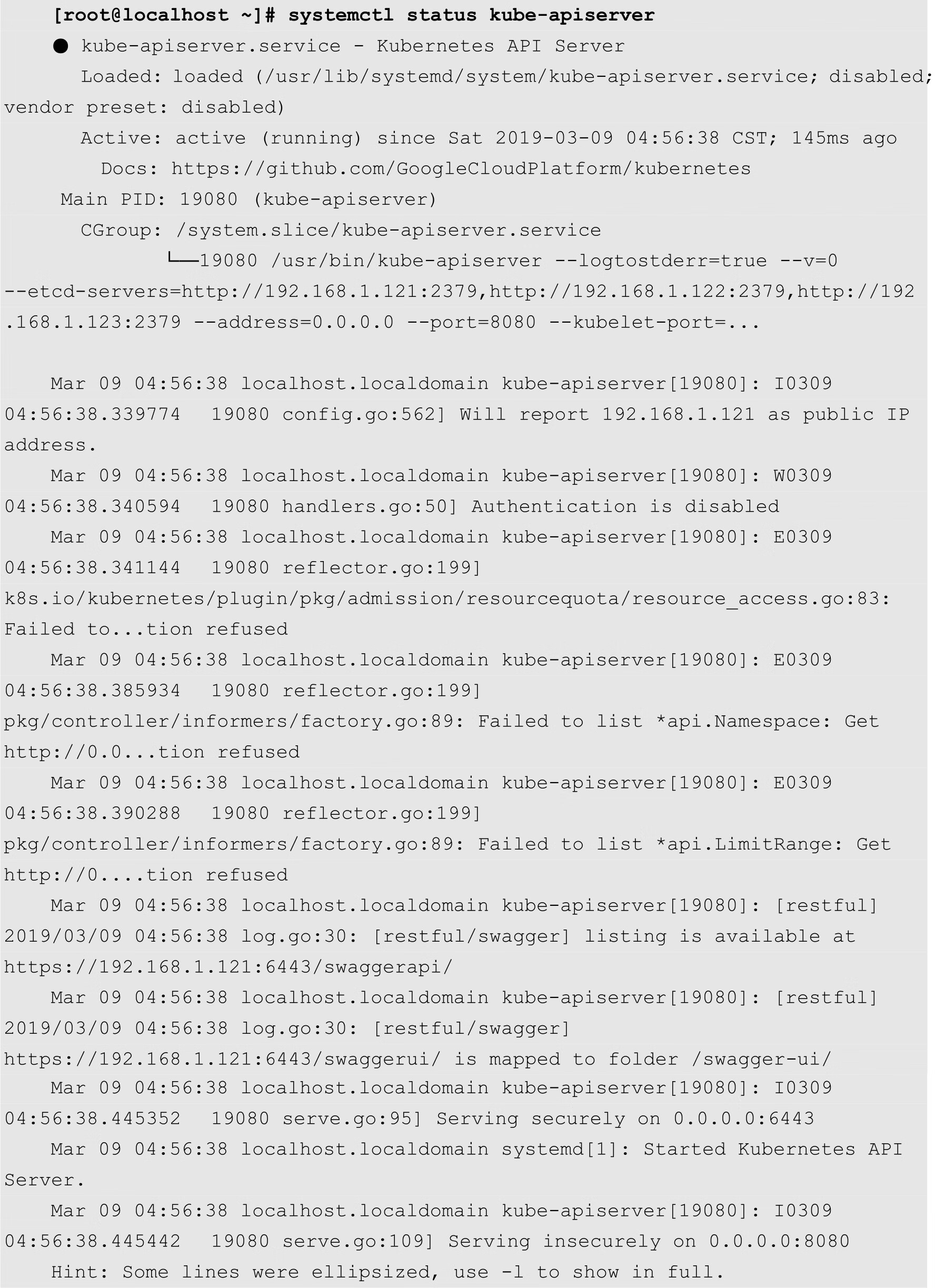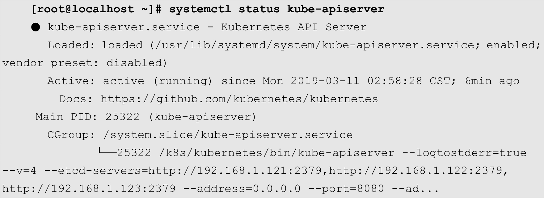 [root@localhost ~]# systemctl enable kube-apiserver [root@localhost ~]# systemctl start kueb-apiserver