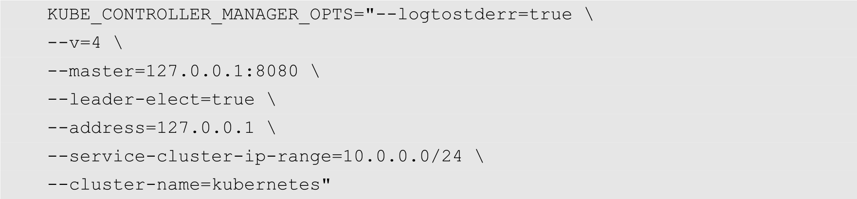 创建配置文件/k8s/kubernetes/cfg/kube-controller-manager,内容如下: