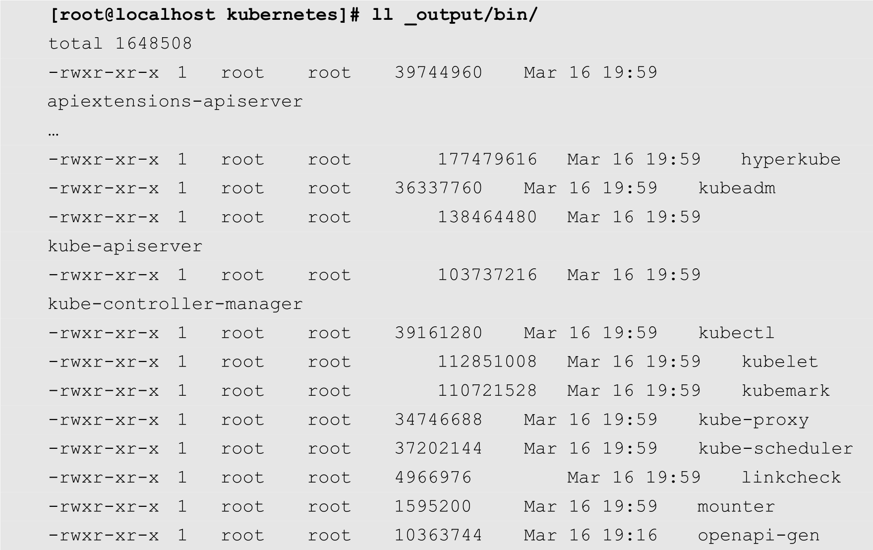编译完成之后,如果没有出错,则将生成Kubernetes的各种可执行文件,文件位于_output/bin目录中,如下所示: