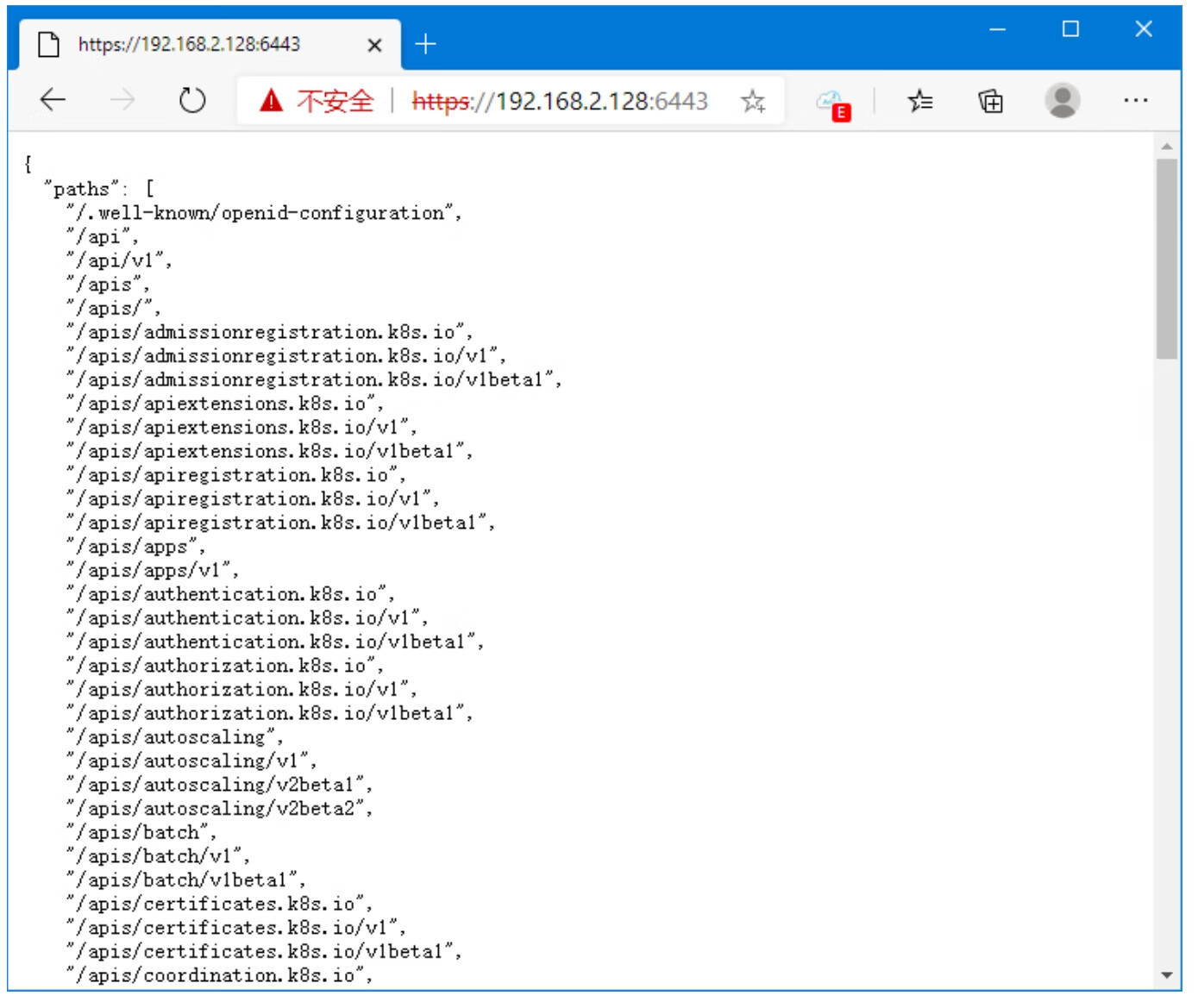 Kubernetes的apiserver提供的各个接口都是RESTful的,用户可以通过浏览器访问Master节点的6443端口,apiserver会以JSON对象的形式返回各个API的地址,如图2-2所示。