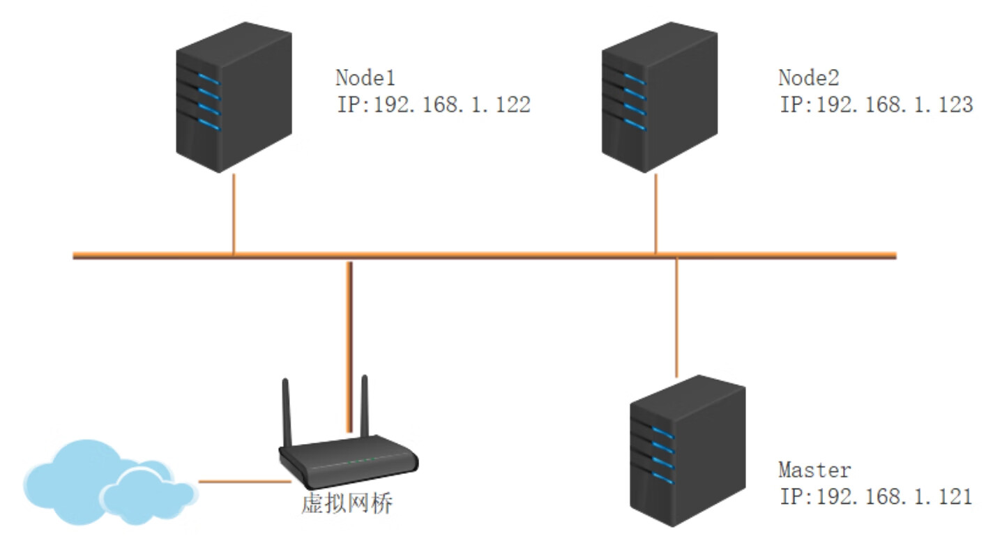 在本例中,部署了3台主机,其中1台为Master节点,另外2台为Node节点,其网络拓扑如图2-1所示。