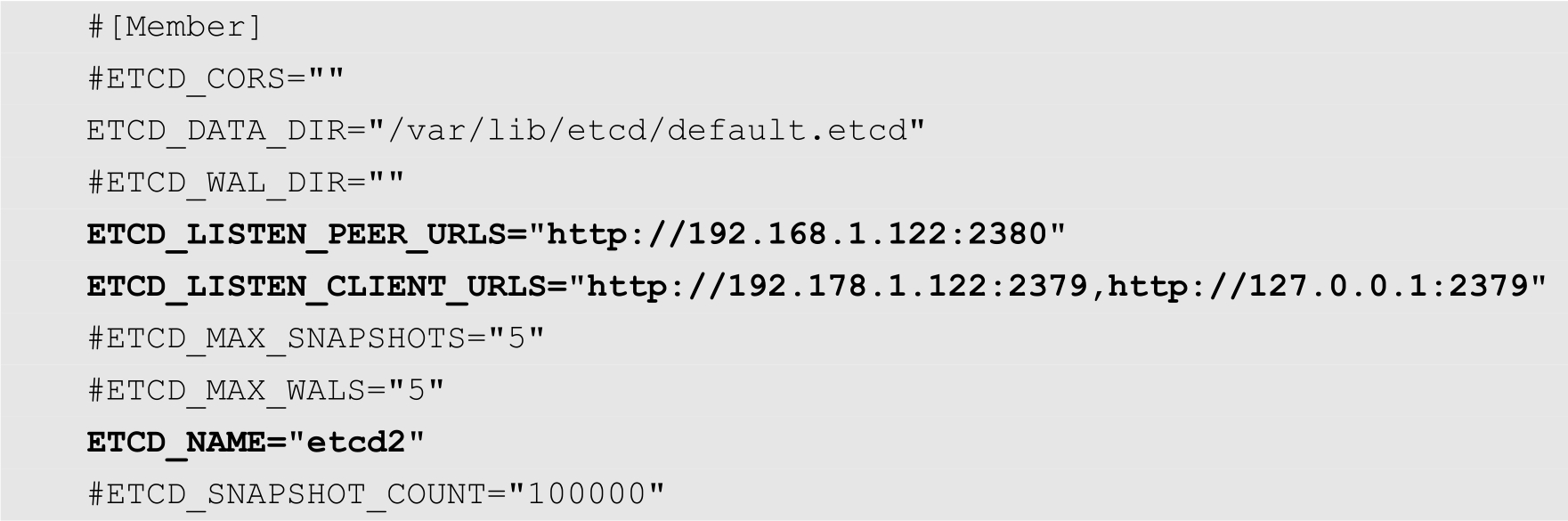 在Node2节点上面执行同样的命令,安装相同的组件,只不过/etc/etcd/etcd.conf文件中的内容与Node1节点稍有不同,需要修改的部分如下所示: