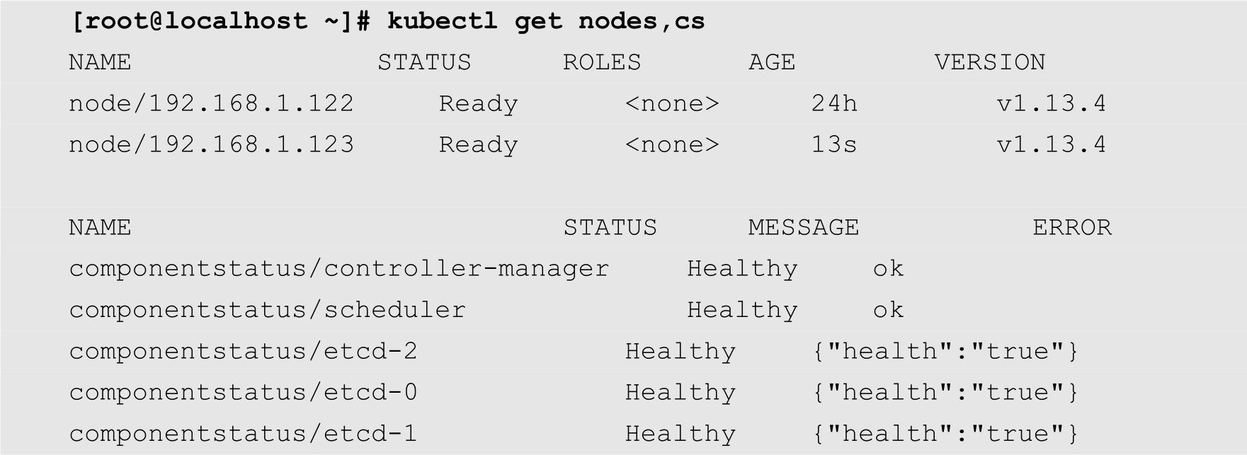 部署完成之后,在Master节点上通过kubectl命令查看节点和组件状态,如下所示: