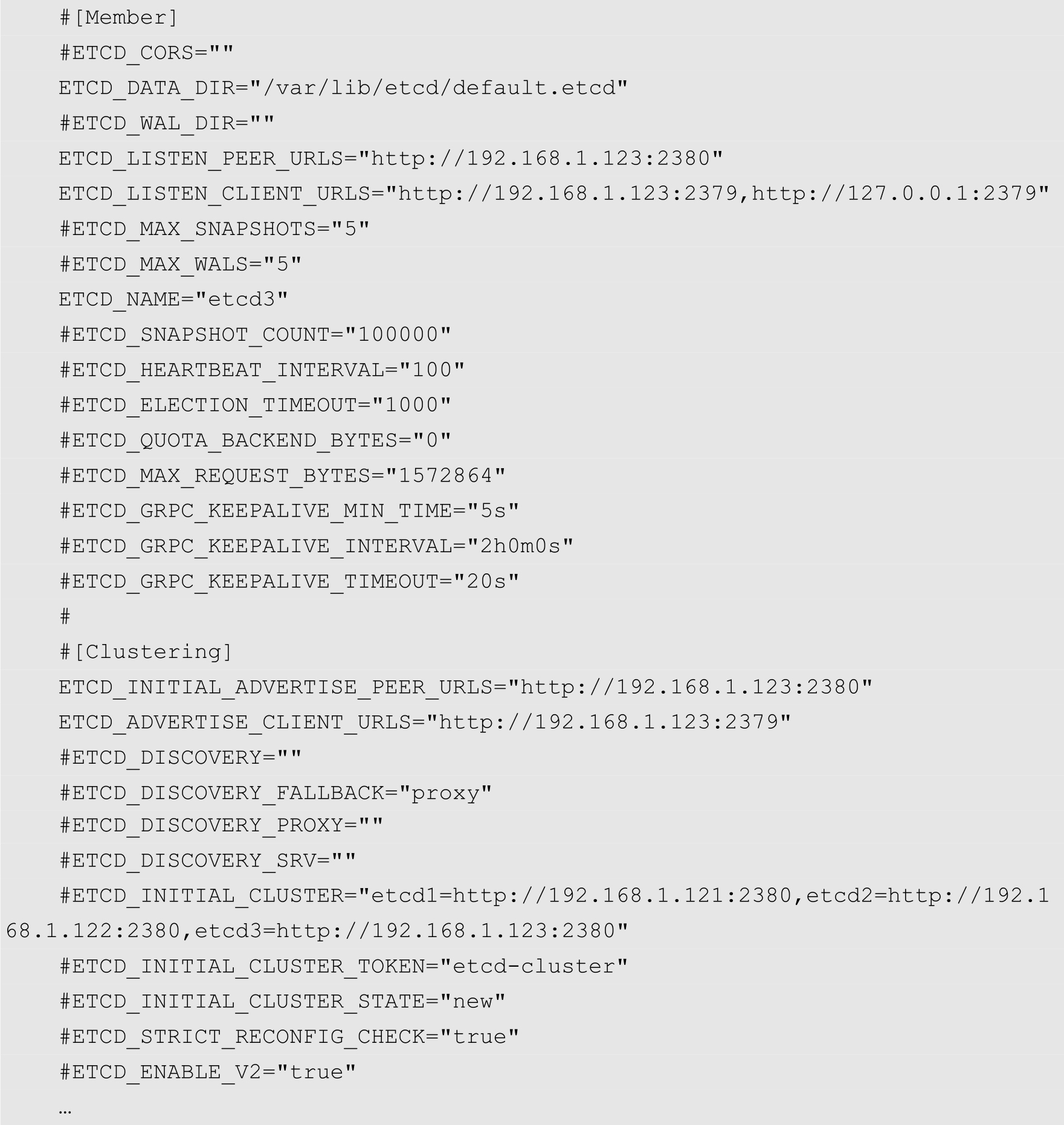 接下来配置etcd。由于我们要在3个节点上都部署etcd,形成一个etcd集群,因此接下来需要分别在3个主机上创建etcd的配置文件。跟前一节中介绍的一样,所有的etcd节点的配置文件基本相同,区别在于绑定的IP地址有所不同。