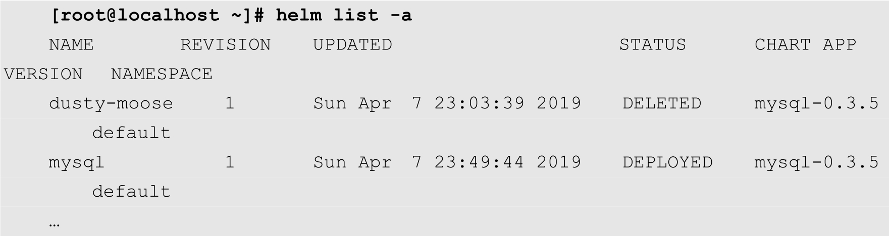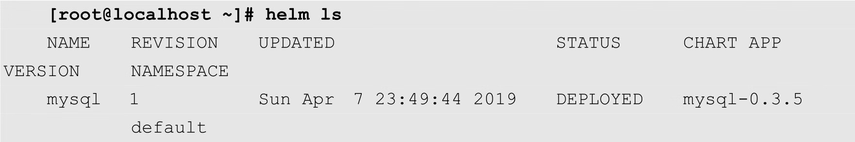 Helm通过helm ls命令查看当前系统中已经安装的Chart列表,也就是Release的列表。如果没有使用选项,该命令默认列出已经成功部署或者失败的Release,如下所示: