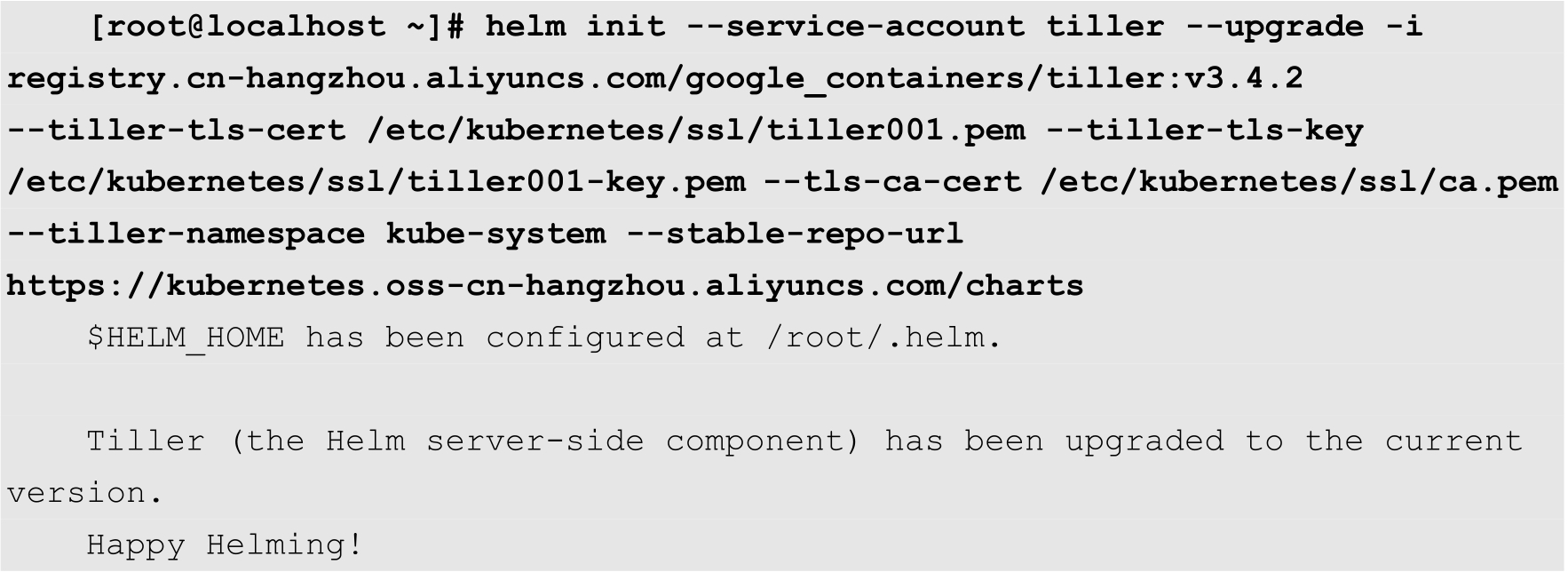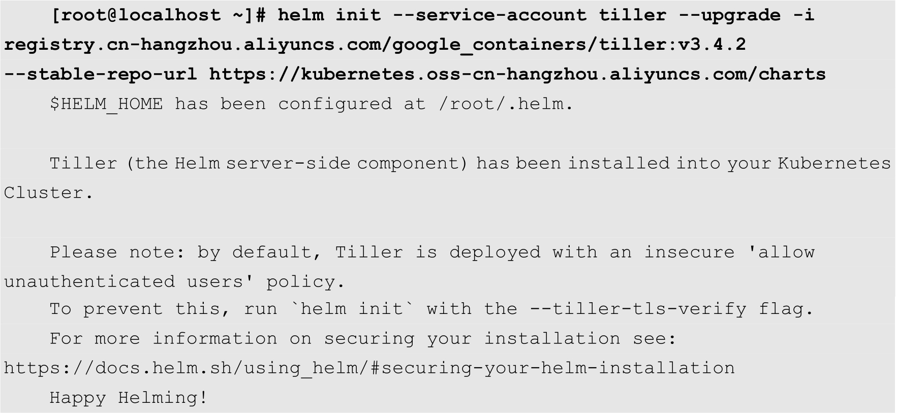 Helm的服务端Tiller是以Deployment方式部署在Kubernetes集群中的。通常情况下,管理员只需使用以下指令便可简单地完成安装: