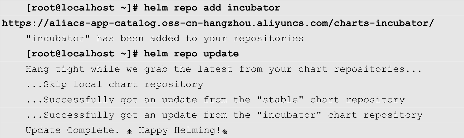 添加软件仓库可以使用helm repo add命令,该命令接受2个参数,第1个为软件仓库的名称,第2个为软件仓库的地址。例如,下面的命令添加国内的阿里云镜像为默认的stable软件仓库: