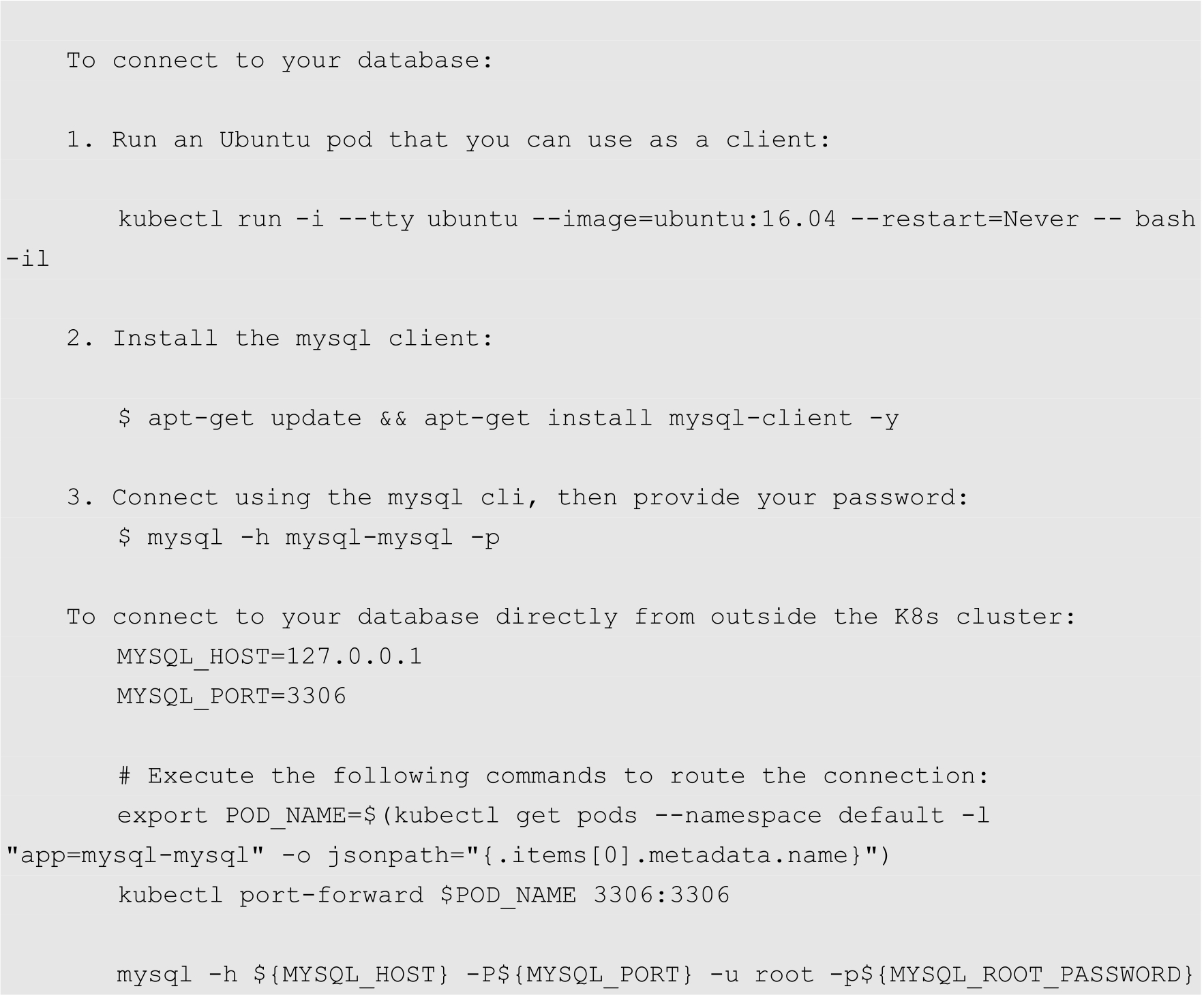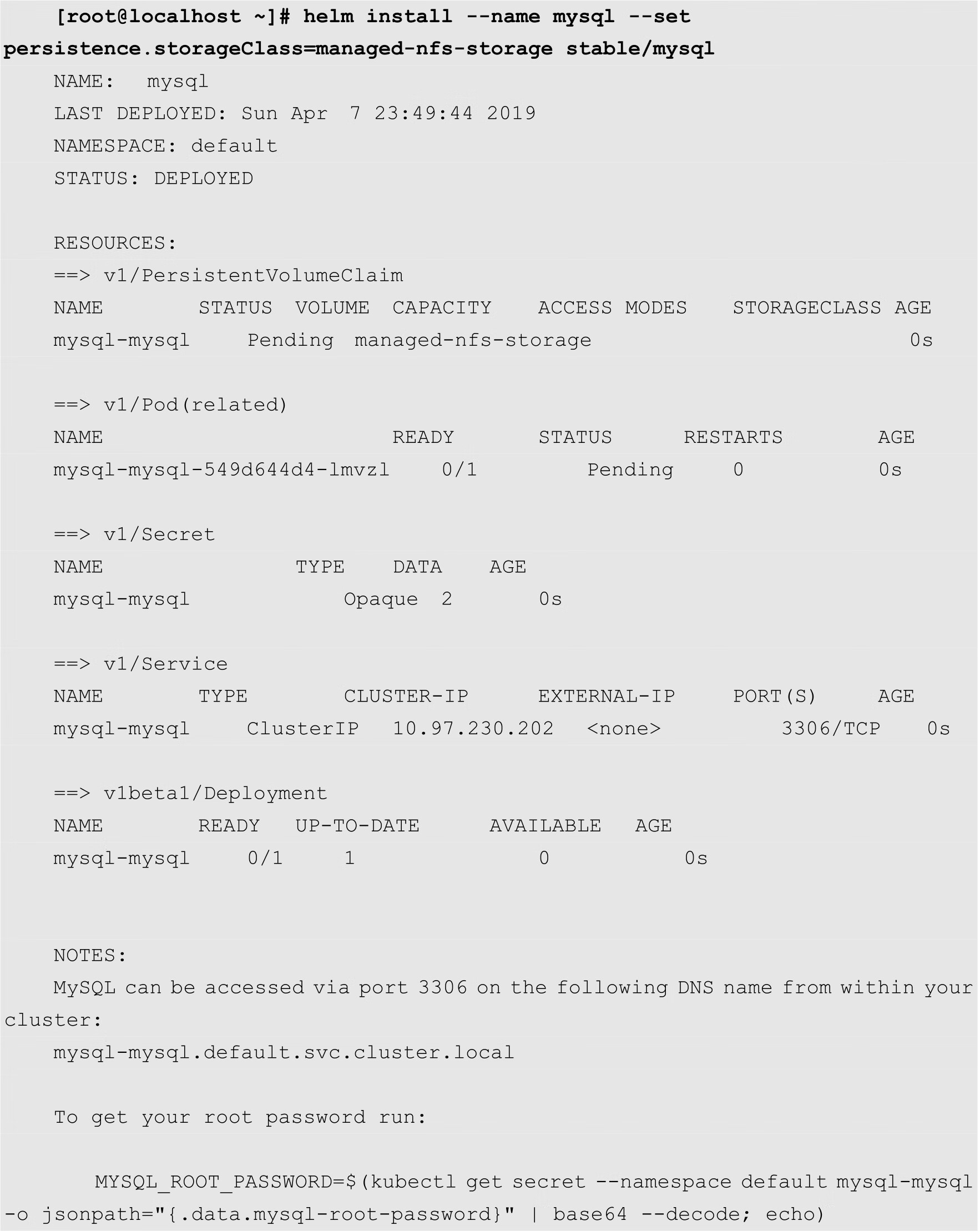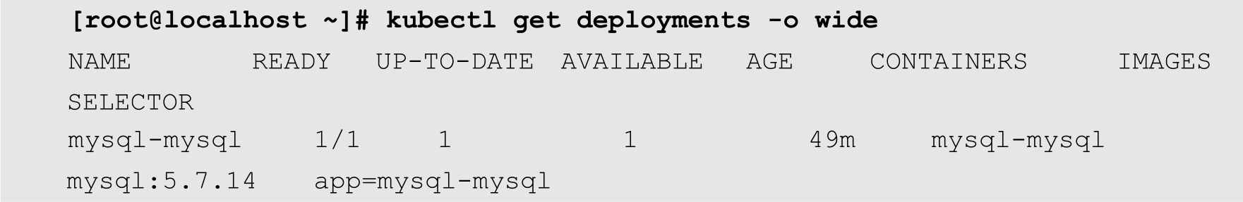 从上面的输出可知,一个名为mysql-mysql的Deployment已经被自动创建,并且其SELECTOR定义为mysql-mysql,这个标签选择器的名称正与前面的Service中选择器的名称一致。