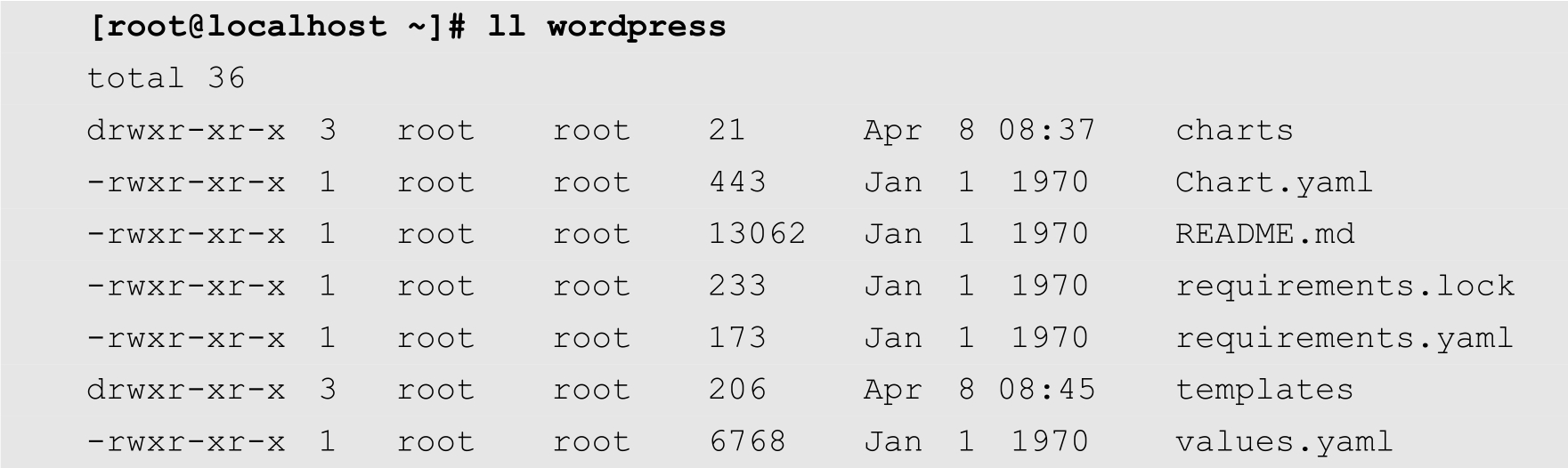 从上面的输出可知,通过helm fetch命令下载到的Chart包,其名称为wordpress-0.8.8.tgz,其中,.tgz表示该文件是经过tar和gzip压缩后的文件。