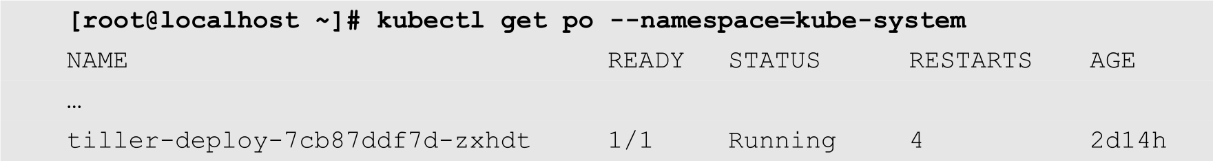 由于Tiller是以Pod的形式运行的,因此用户可以使用kubectl命令查看其状态,如下所示: