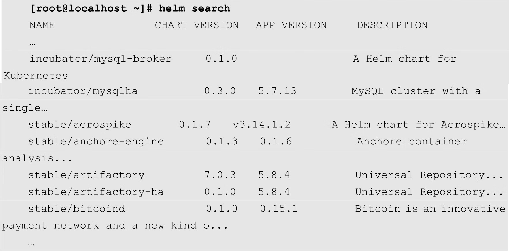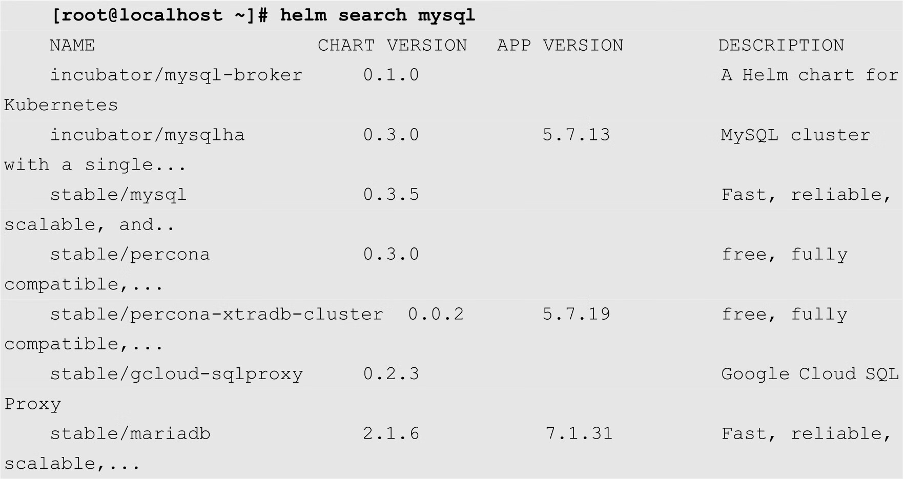 在上面的输出列表中,NAME为Chart的路径名,斜线前面为软件仓库的名称,后面为Chart的包名。CHART VERSION为Chart包的版本号,APP VERSION为Chart包的软件版本。例如,incubator/mysqlha的Chart包版本为0.3.0,该Chart包中的MySQL的版本号为5.7.13。