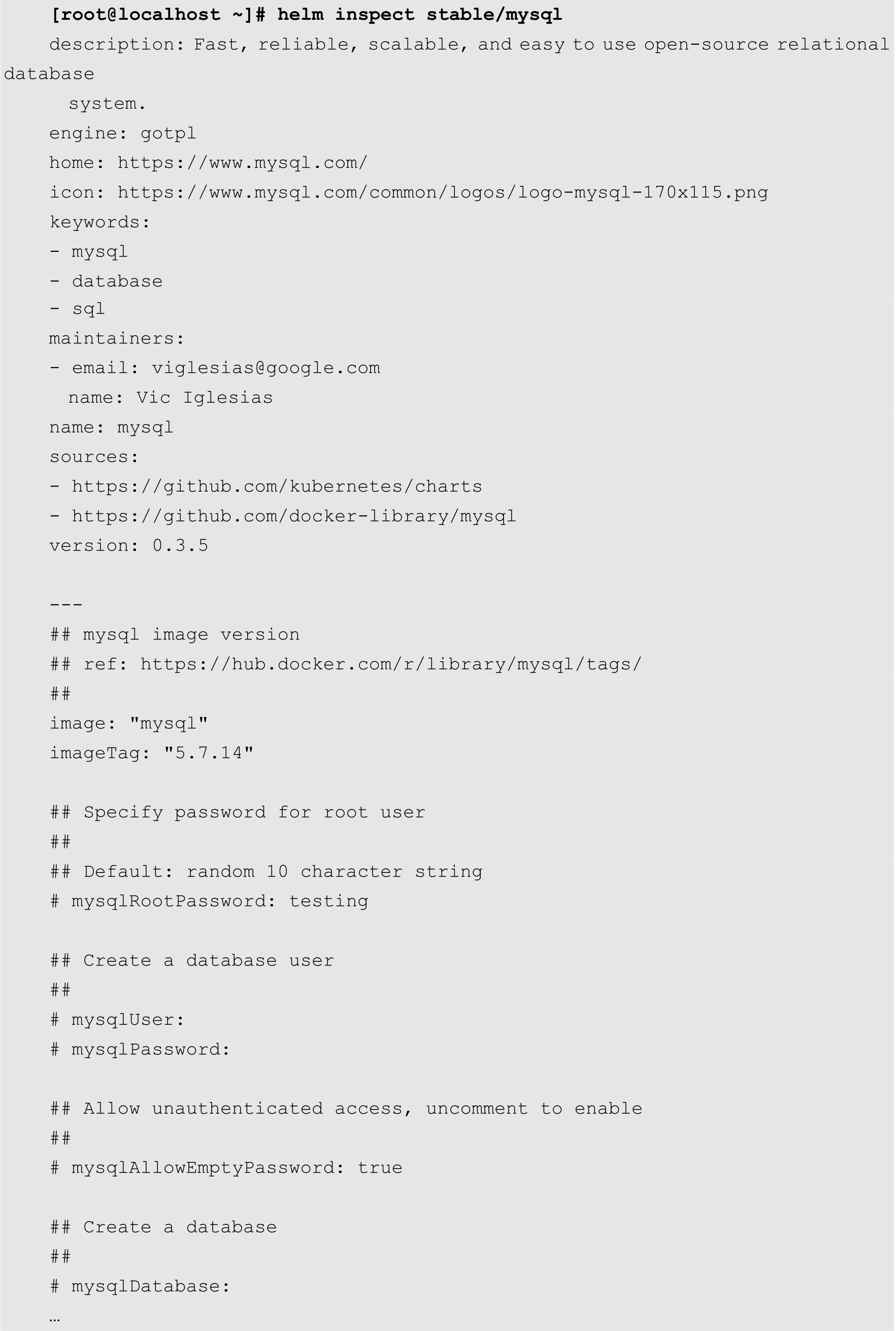 对于某个具体的Chart包,用户可以通过helm inspect命令查看其详细信息,如下所示: