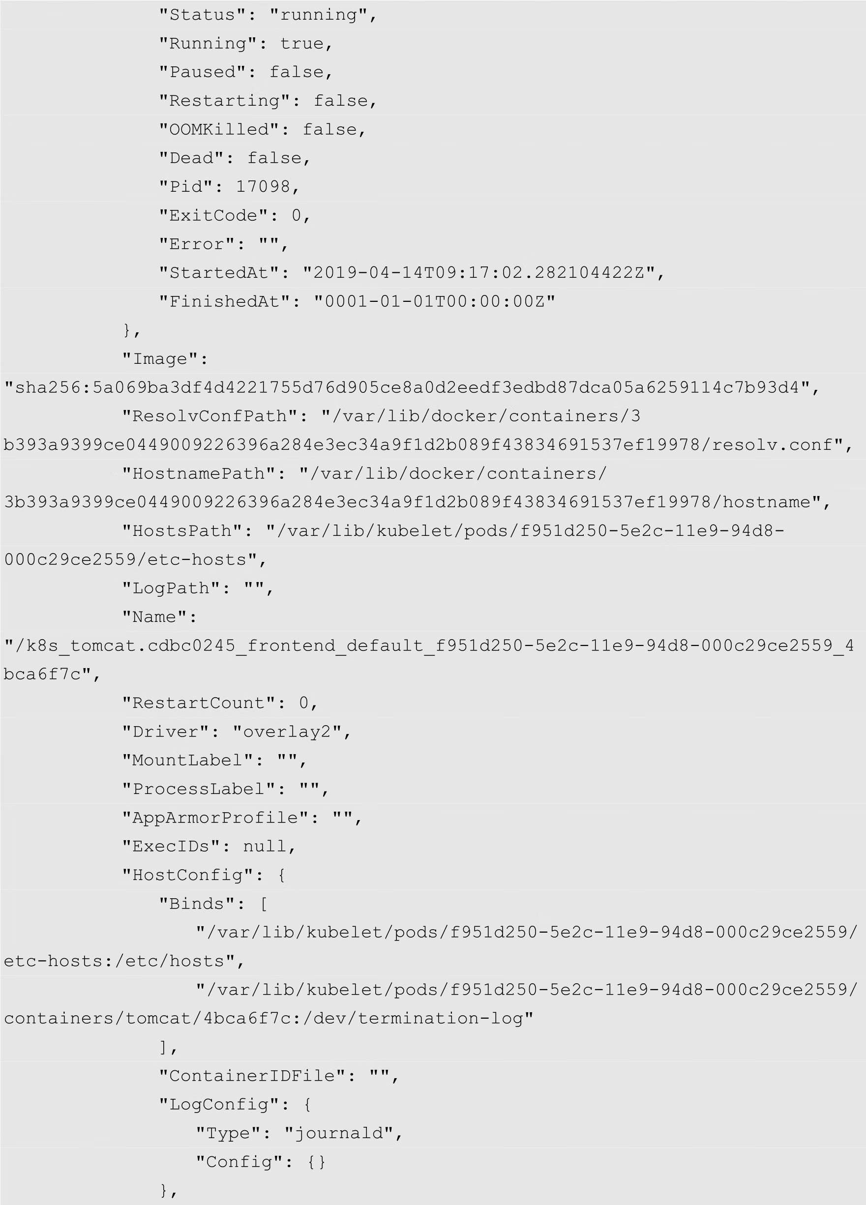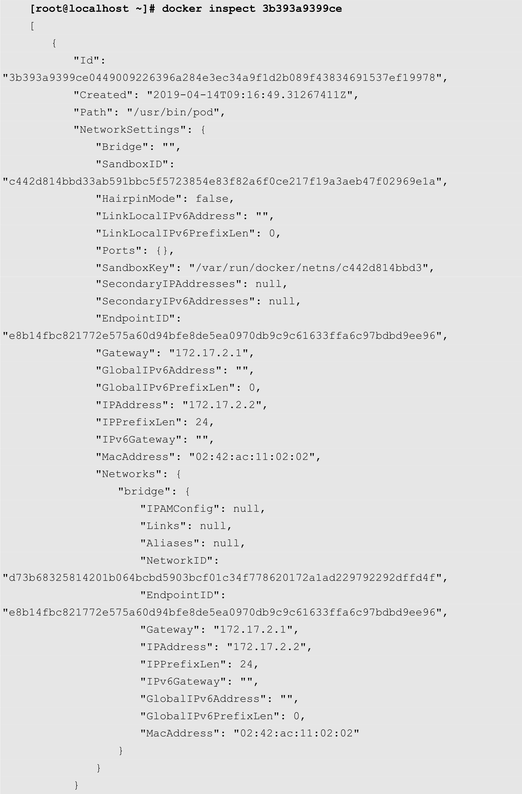 下面的命令显示了同一个Pod里面的不同容器的信息。其中,pause容器的信息如下: