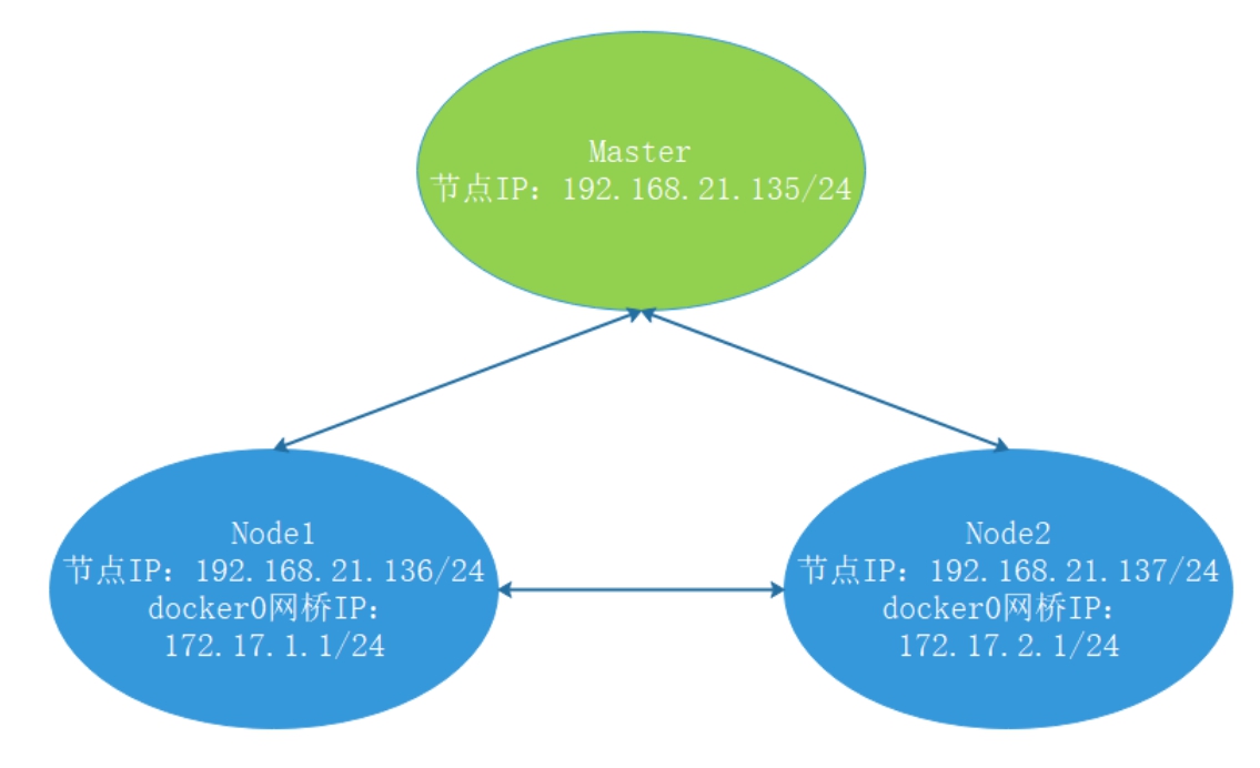 通过以上配置,Node1和Node2中容器就会分别赋予172.17.1.0/24和172.17.2.0/24这两个网络的IP地址,并且默认的网关将被分别设置为docker0的IP地址,即172.17.1.1和172.17.2.1。