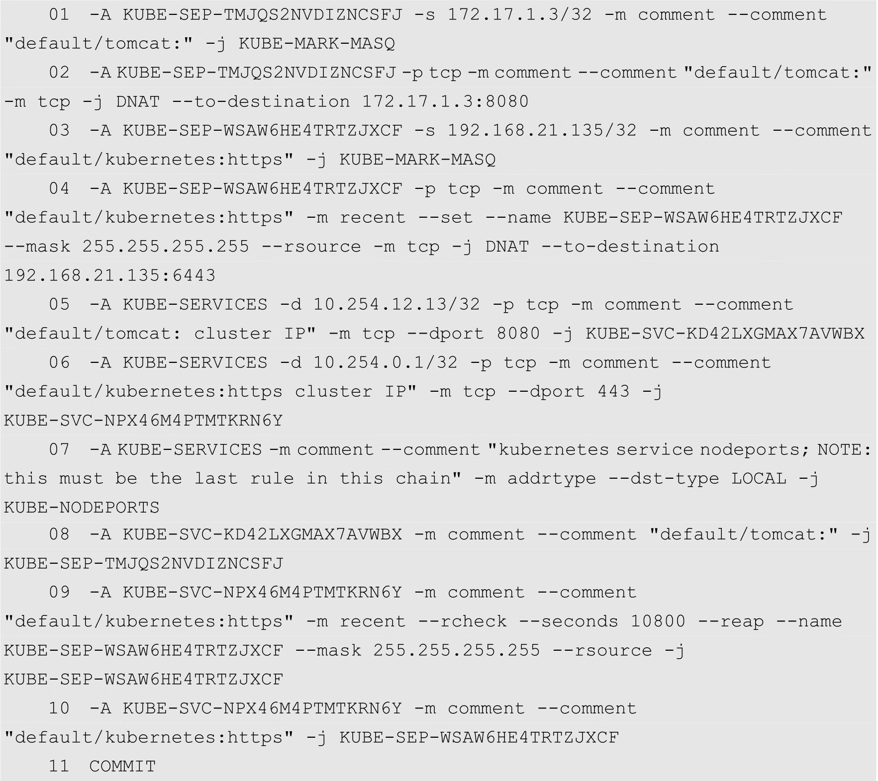 在任何一个节点上使用iptables-save命令查看iptables的规则,会发现多出多条与ClusterIP有关的规则,如下所示: