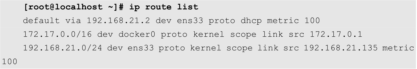 [root@localhost ~]# ip route add 172.17.2.0/24 via 192.168.21.137