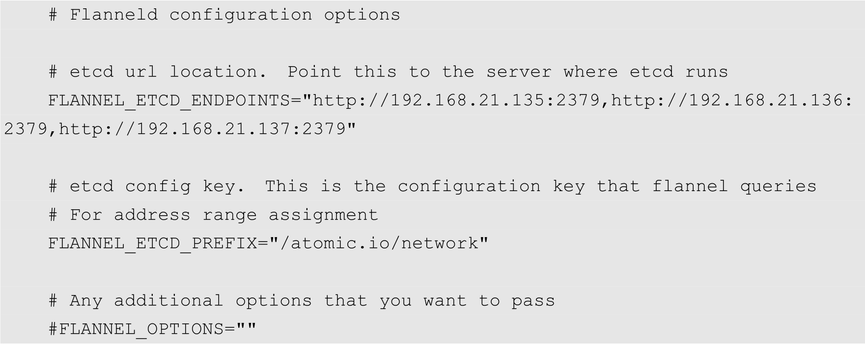 然后修改Flannel的配置文件/etc/sysconfig/flanneld,增加etcd的访问地址,内容如下: