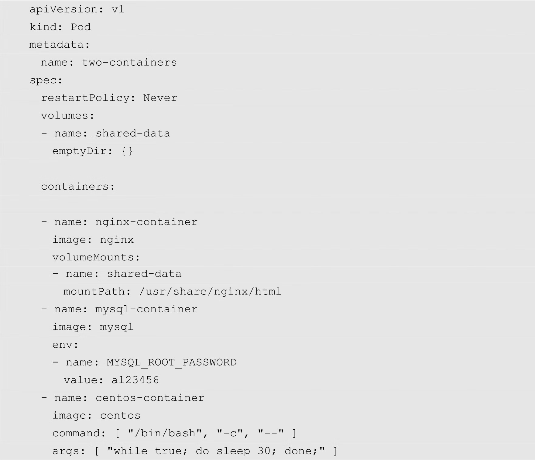 从上面的代码可知,该Pod包含3个容器,分别为nginx-container、mysql-container和centos-container。