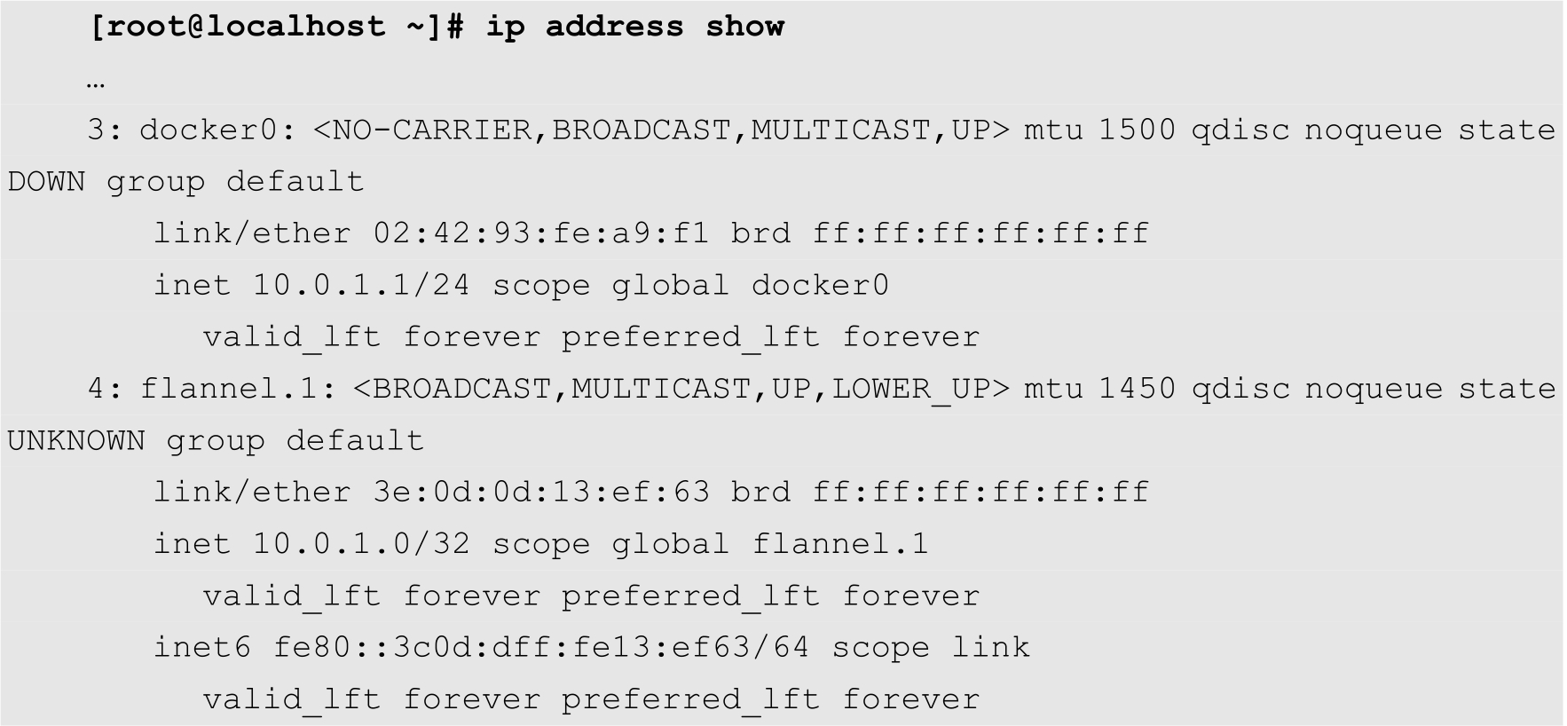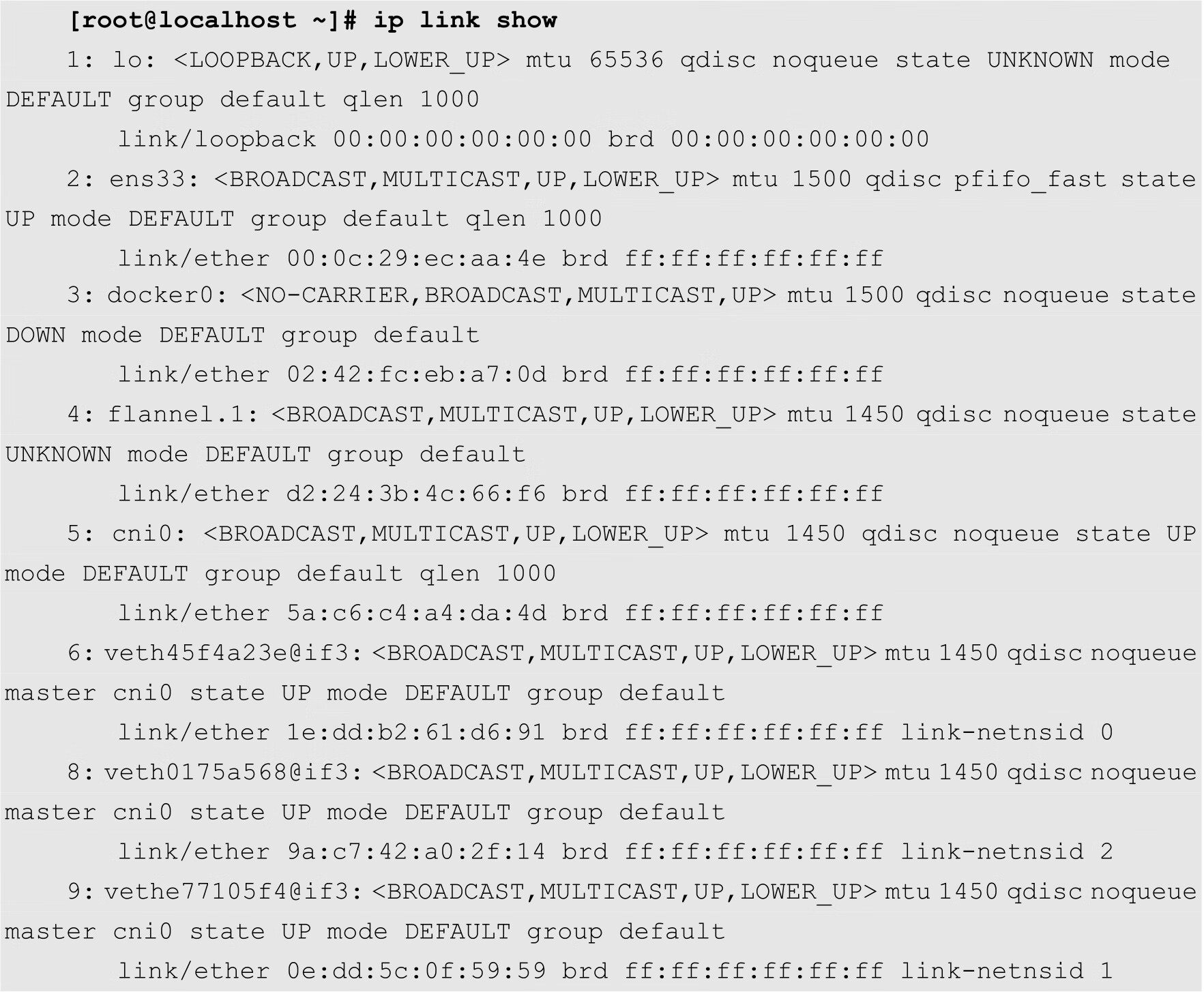 实际上,在同一个节点中,不同的Pod通过一个名为docker0的网桥连接起来。例如,用户可以通过以下命令将当前节点的网络接口罗列出来: