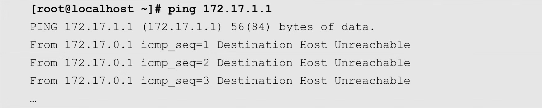 以上信息表明,在其他的两个节点上,没有发现到172.17.1.0/24网络的路由。如果通过ping命令分别在2个节点上测试到172.17.1.0/24网络的网关,即Node1上的docker0的IP地址172.17.1.1的连通性,则会输出以下结果: