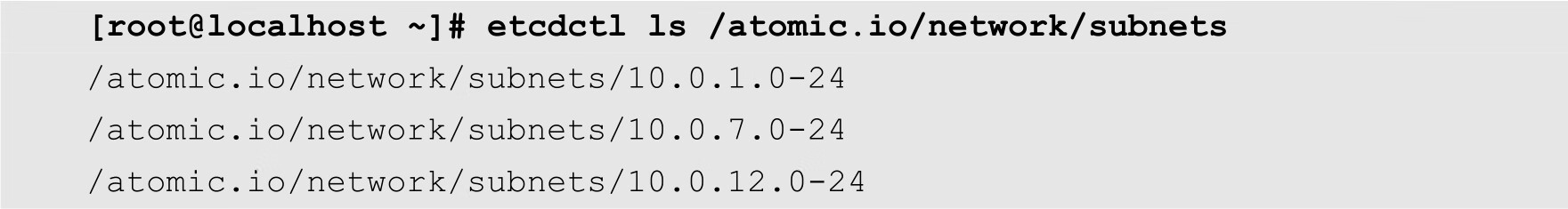 然后,用户可以在任意节点上执行以下命令,查看保存在etcd中的子网信息,如下所示: