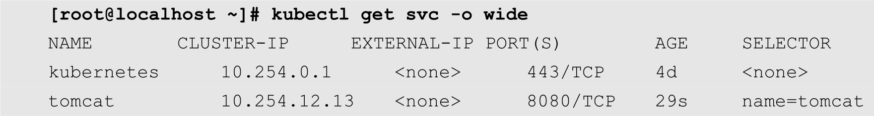 从以上命令的输出可知,Kubernetes已经为名为tomcat的服务分配了一个ClusterIP,其值为10.254.12.13,端口为8080,选择器为name=tomcat。