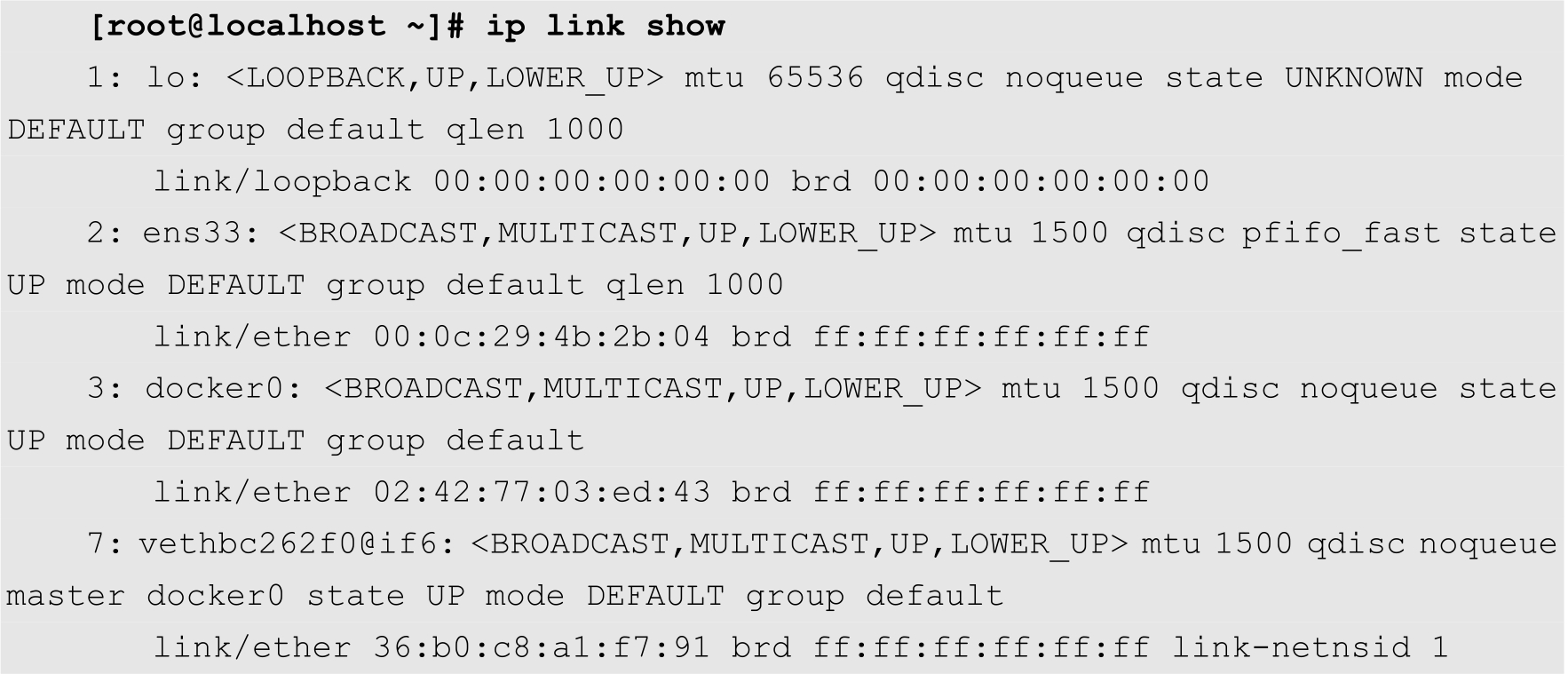 在Linux系统中,管理员可以通过ip命令来查看当前系统中的veth,如下所示:
