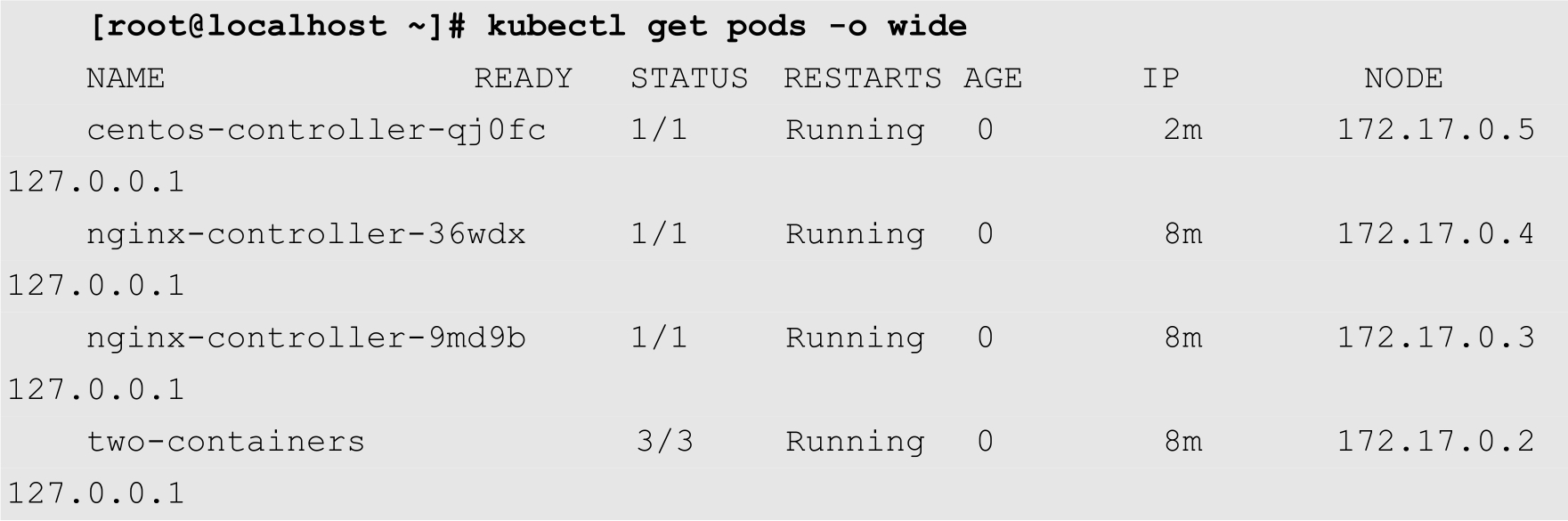 这4个Pod的IP地址分别为172.17.0.2~172.17.0.5。下面先进入名为centos-controller -qj0fc的容器,命令如下: