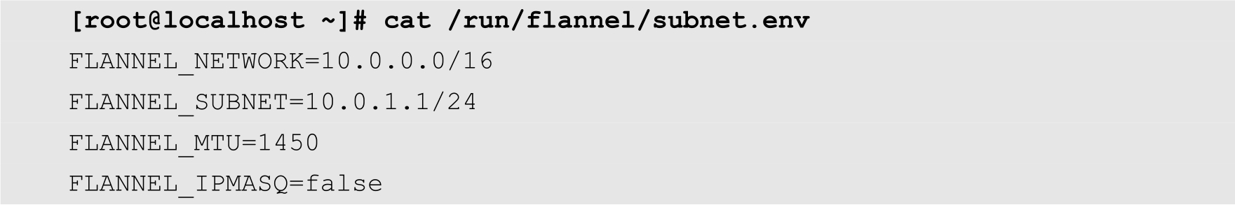 在Flannel启动之后,会生成一个环境变量文件,包含了当前主机要使Flannel通信的相关参数,如下所示: