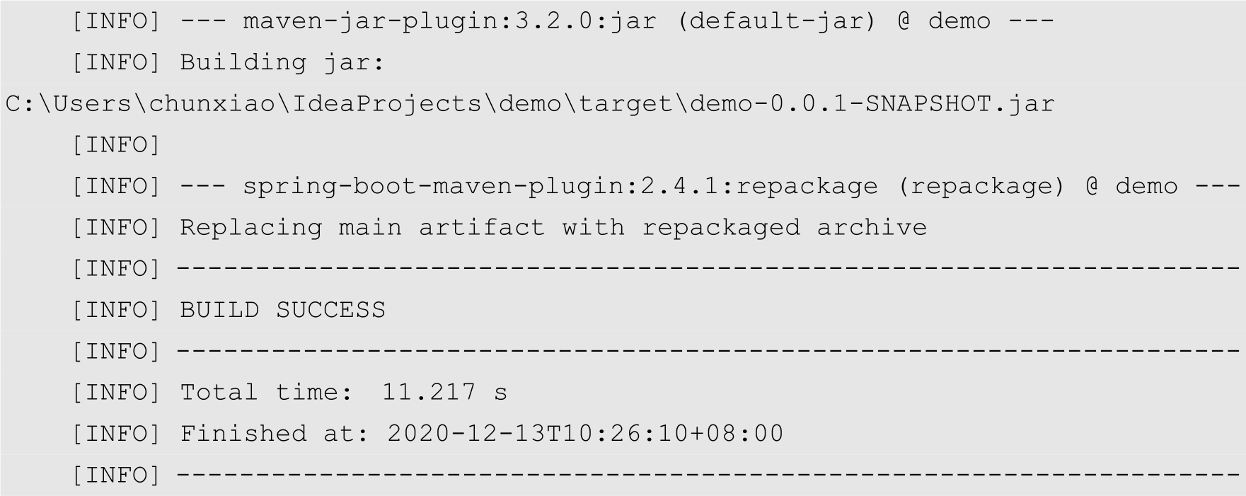 在后面的步骤中,我们需要把生成的名称为demo-0.0.1-SNAPSHOT.jar的文件放到一个Docker镜像文件中。