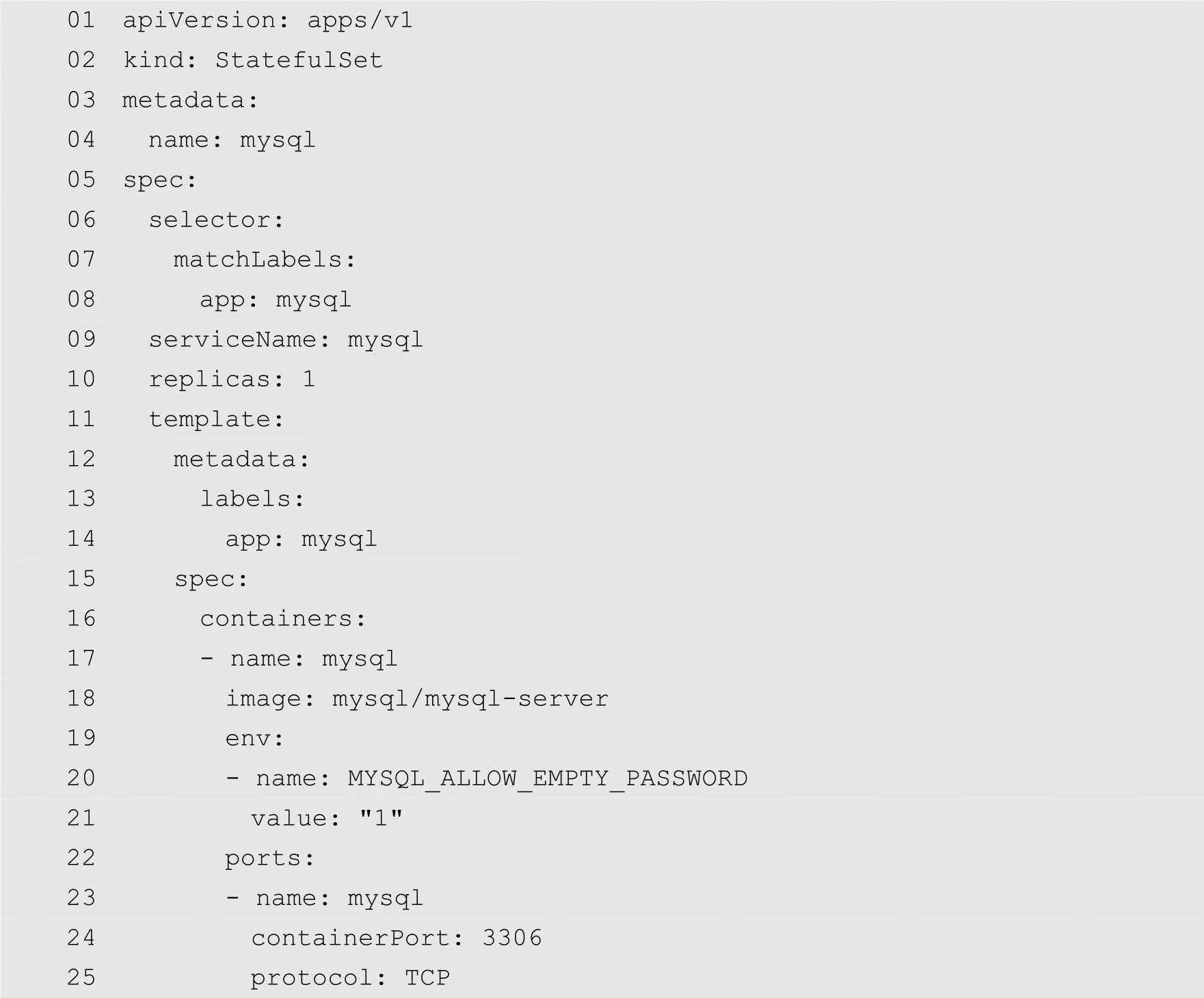 第9行指定解析该Pod的IP地址的服务的名称。第18行指定所使用的镜像为mysql/mysql-server。第19行通过env字段为MySQL指定一些环境变量,在本例中,设置的环境变量为MYSQL_ALLOW_EMPTY_PASSWORD,其值为1,表示允许空密码。第24行指定容器暴露的端口为3306。