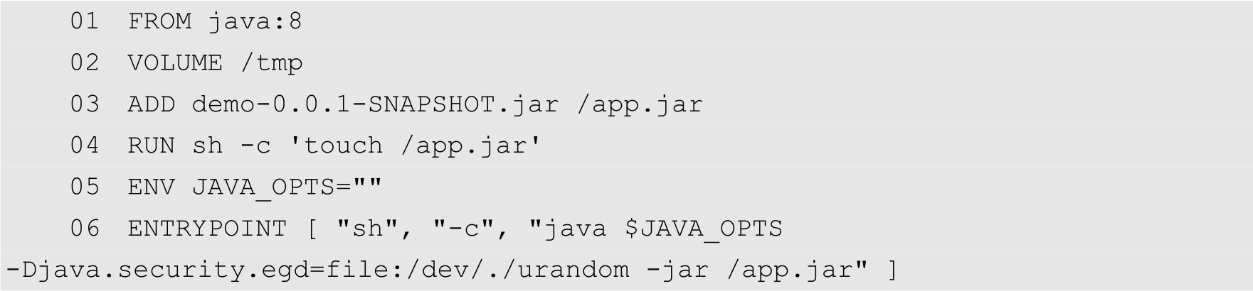 为了能够生成Docker镜像文件,我们需要编写一个Docker文件。该文件的功能是告诉Docker如何构建镜像文件,代码如下: